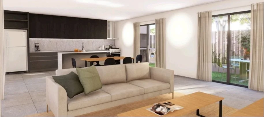 3 dormitorios, 2 baños completos + toilette, estar-comedor con cocina integrada, jardín privado con parrillero y cochera.