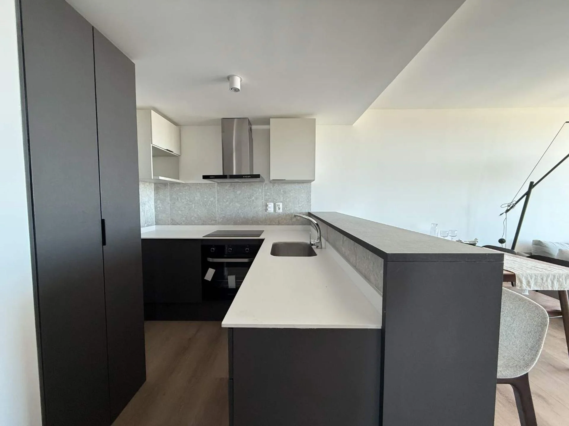Living comedor con cocina integrada, con muebles aéreos y bajo mesada, equipado con horno, anafe y campana.