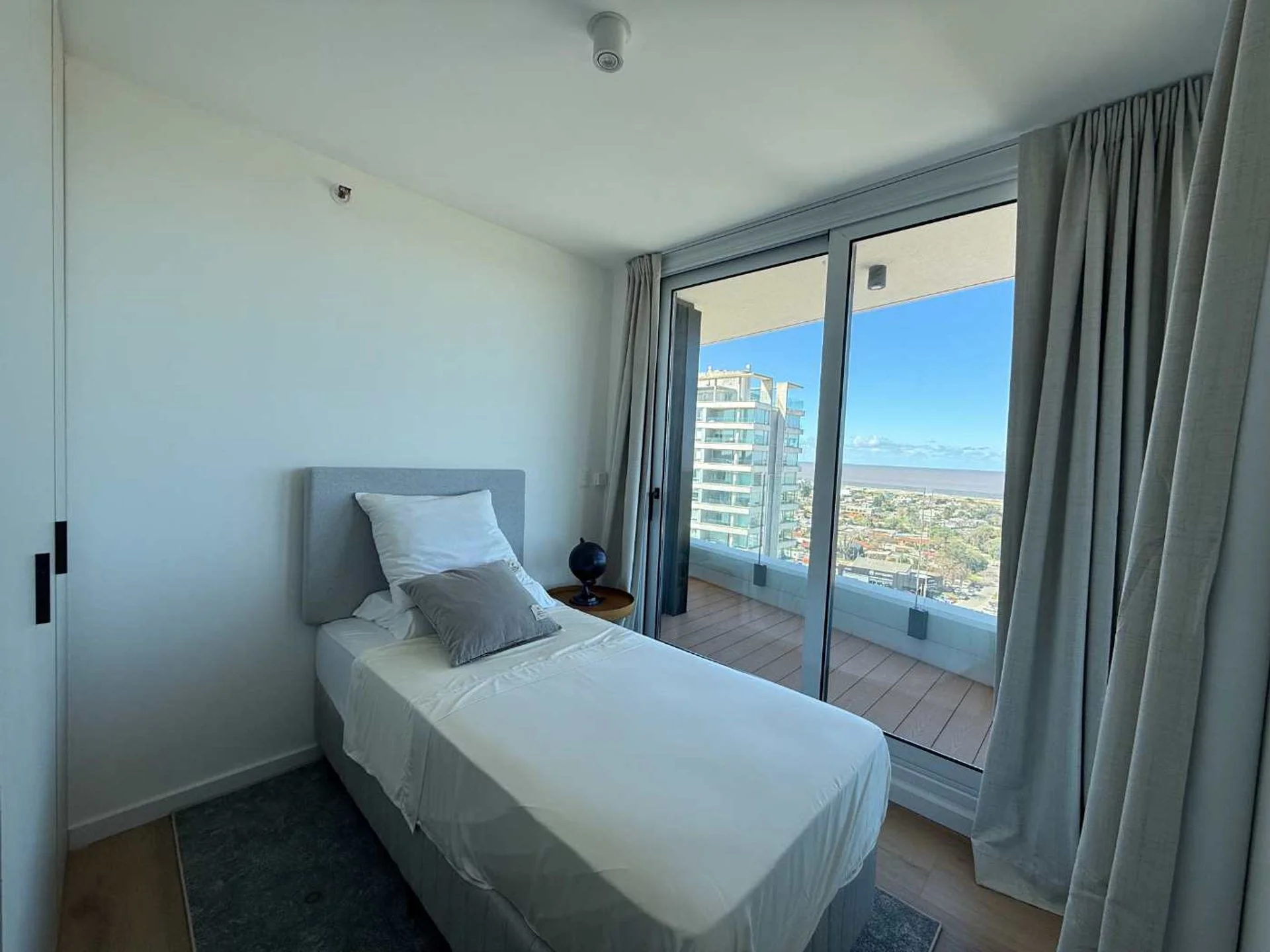 Ubicado en el piso 16, este exclusivo apartamento ofrece vistas despejadas desde todos sus ambientes y una enorme terraza al frente que conecta todos los dormitorios y el living principal desde donde se puede contemplar el mar pues es una ubicación frente/sur