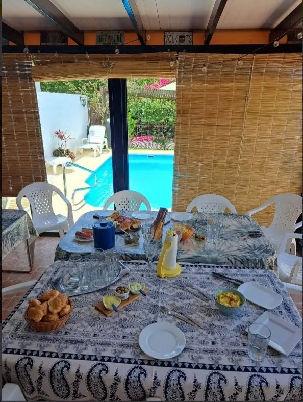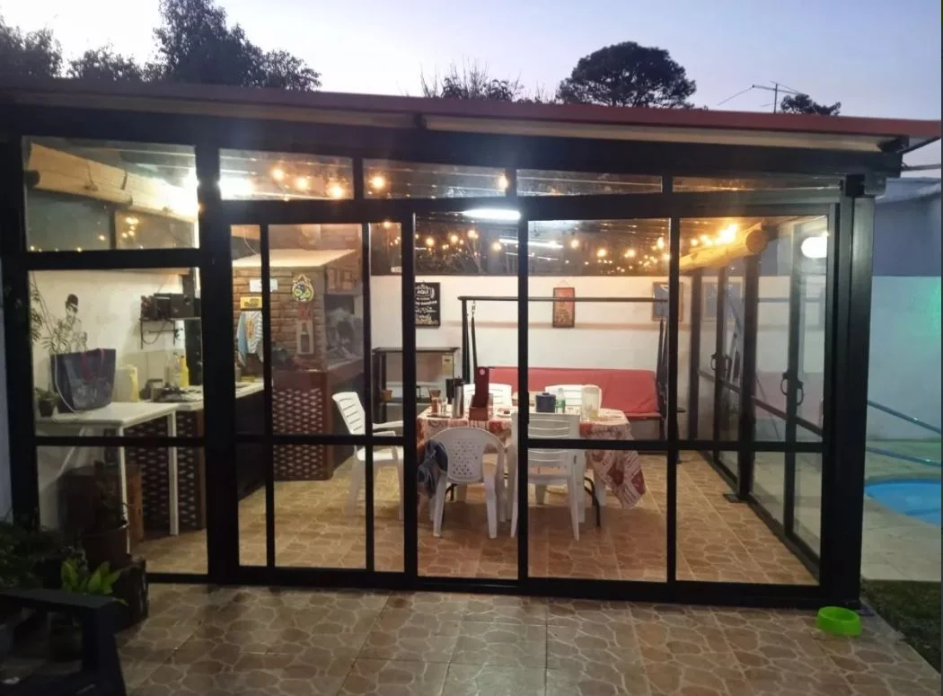 La barbacoa, con parrillero completo, mesa y sillas y TV Smart, es techada, está cerrada y está al lado de la piscina y del patio, con hamacas paraguayas, reposeras, sillas de playa y 2 sombrillones grandes.
