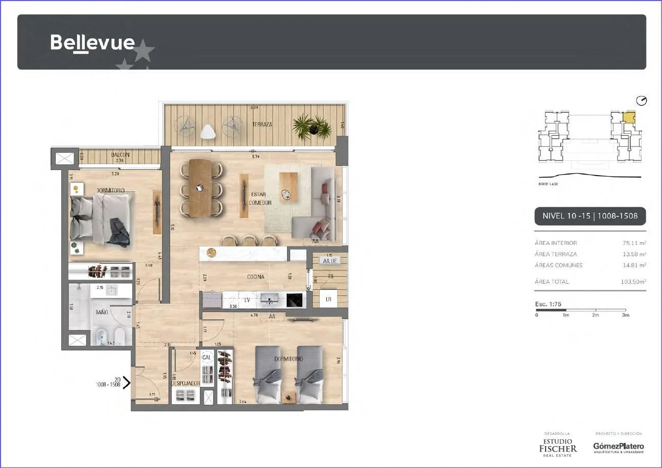 Living comedor con terraza, despojador, cocina semi integrada con barra y placares, 2 dormitorios, 1 con terraza, 1 baño. Lavadero.