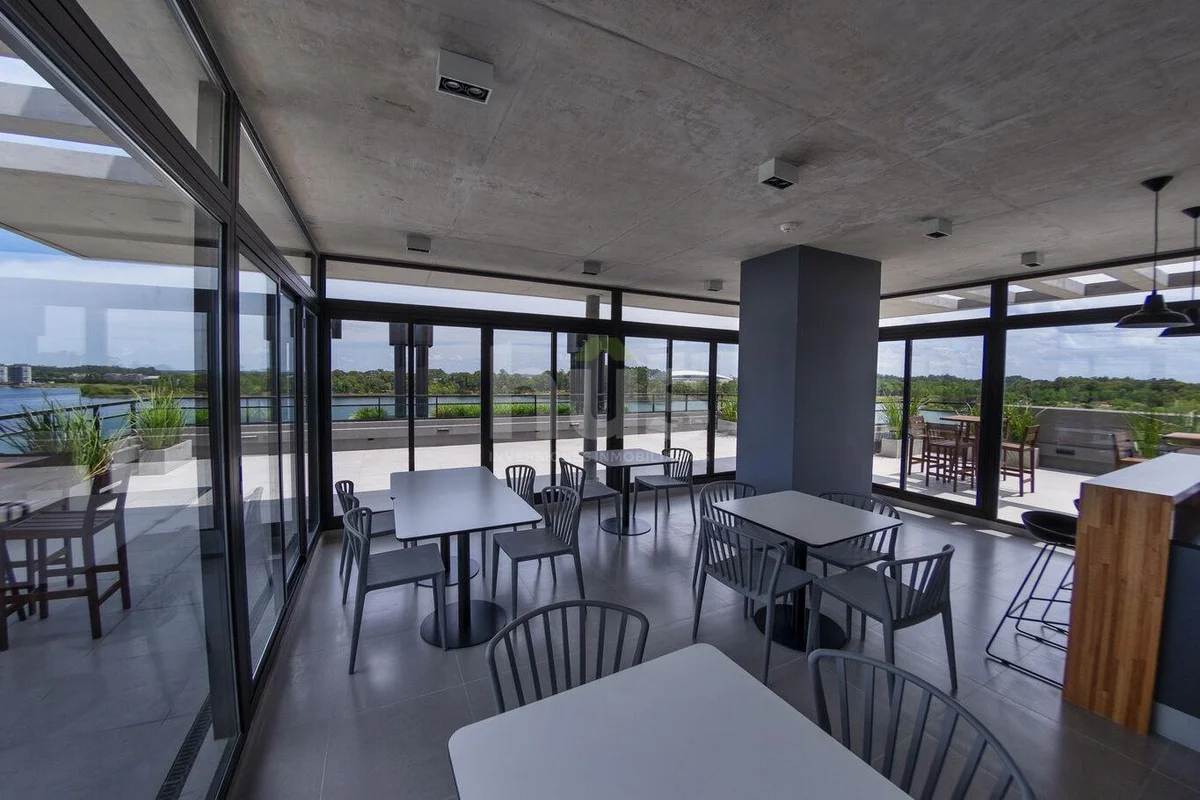 Edificio con elegante lobby de doble altura, barbacoa en último piso con gran terraza, muelle privado, solarium, juegos infantiles, gimnasio, video portero las 24 hs.