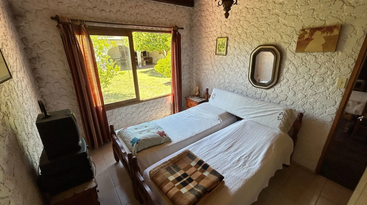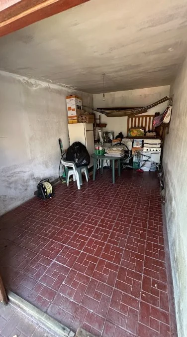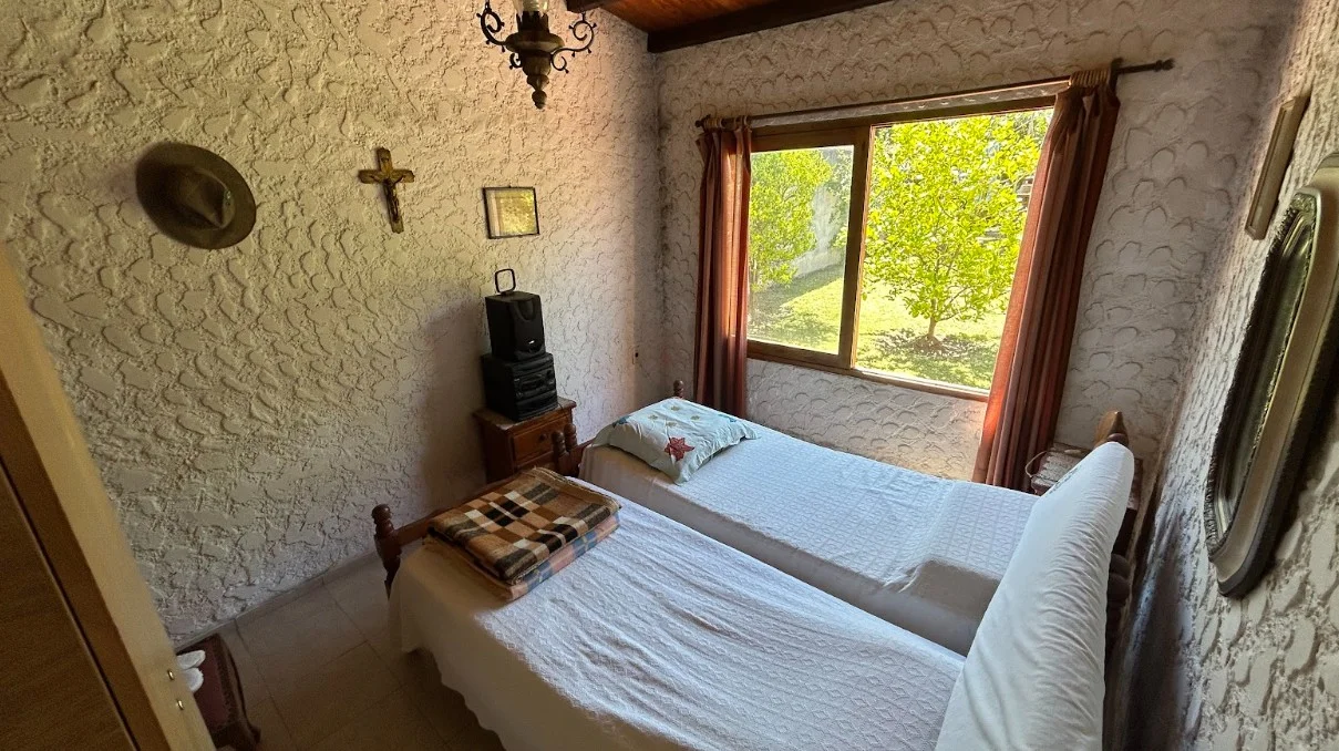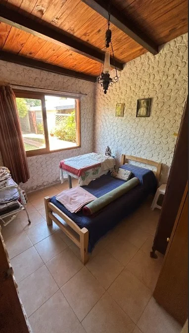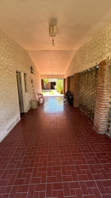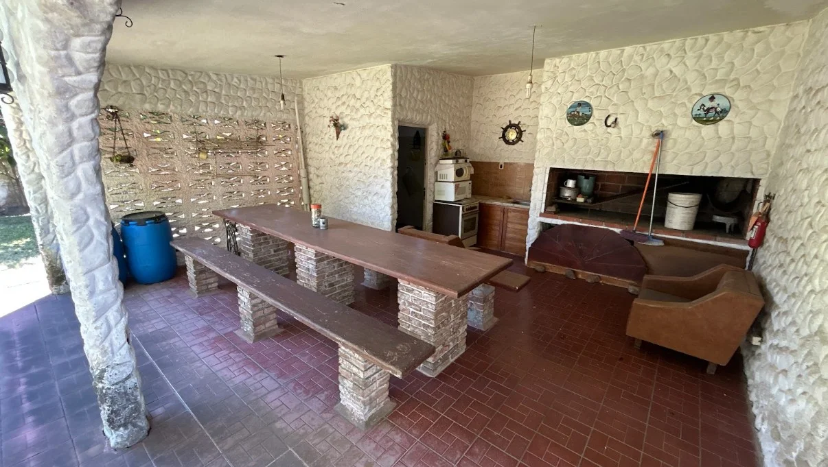 Amplio fondo arbolado con barbacoa techada, parrillero, baño y garaje.