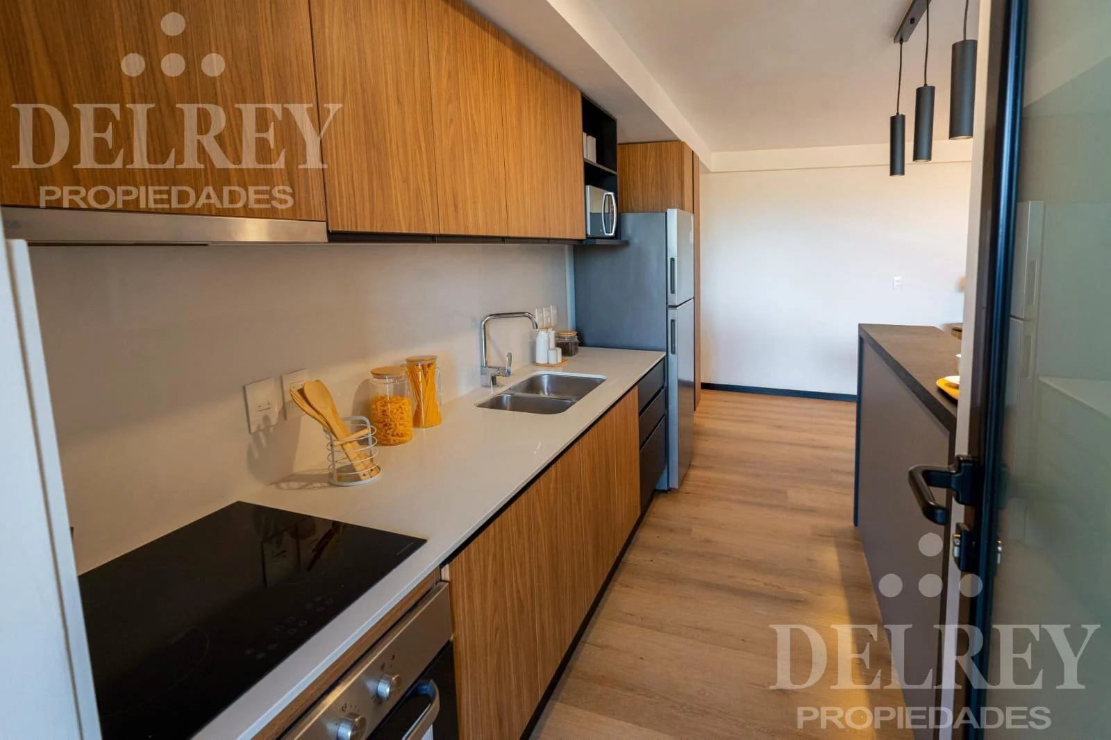 Cocina integrada definida en su espacio, incluye pileta de acero inoxidable, horno eléctrico, anafe y campana.