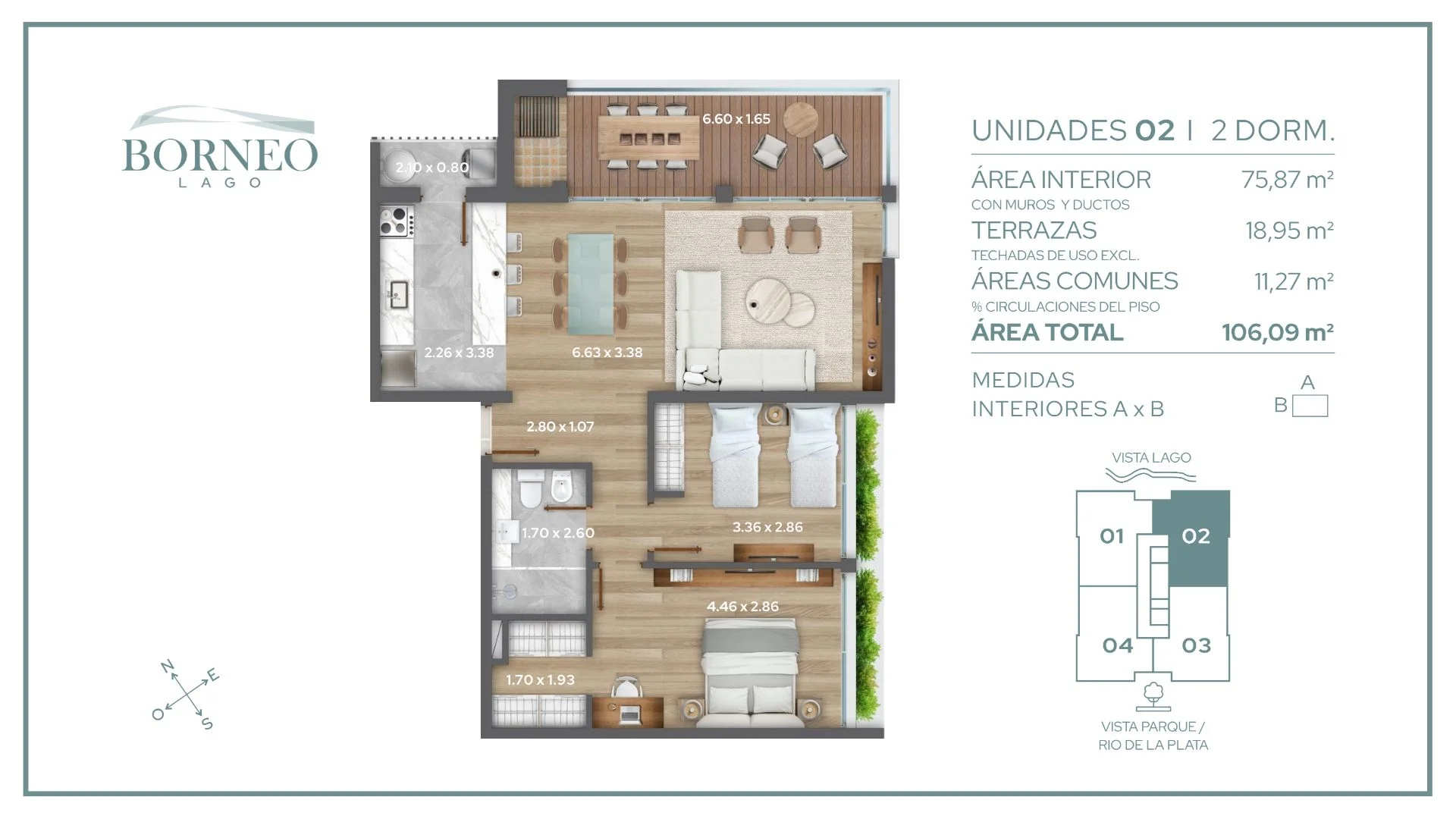 Borneo Lago es ideal para quienes buscan vivir en un entorno natural, tranquilo y cerca de la ciudad. Está ubicado entre el Parque Roosevelt y el Lago Calcagno, una zona perfecta para familias jóvenes que quieren más aire libre, verde y calidad de vida.