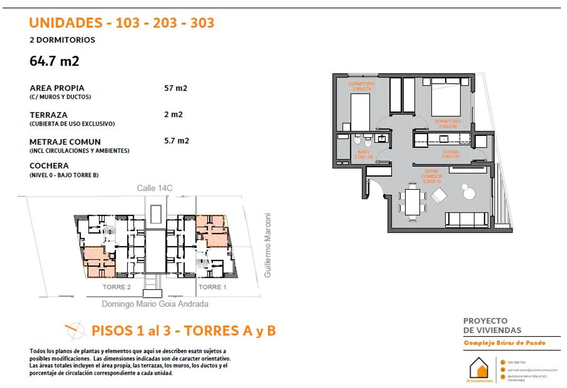 El apartamento disponible es el 103, ubicado en un primer piso. Puede estar en la torre A o en la torre B. La unidad tiene una superficie de 57 m², con una distribución funcional. Cuenta con dos dormitorios, cocina, living, baño y todos los ambientes definidos, además de una terraza de 2 m². Comparte piso con un solo apartamento, ofrece una vista despejada, excelentes terminaciones, y aberturas con doble vidrio que aseguran aislamiento térmico y acústico. Es una excelente oportunidad para adquirir un apartamento moderno con los mejores amenities que hay en la zona. Además, existe la posibilidad de adquirir una cochera por USD 3.000.