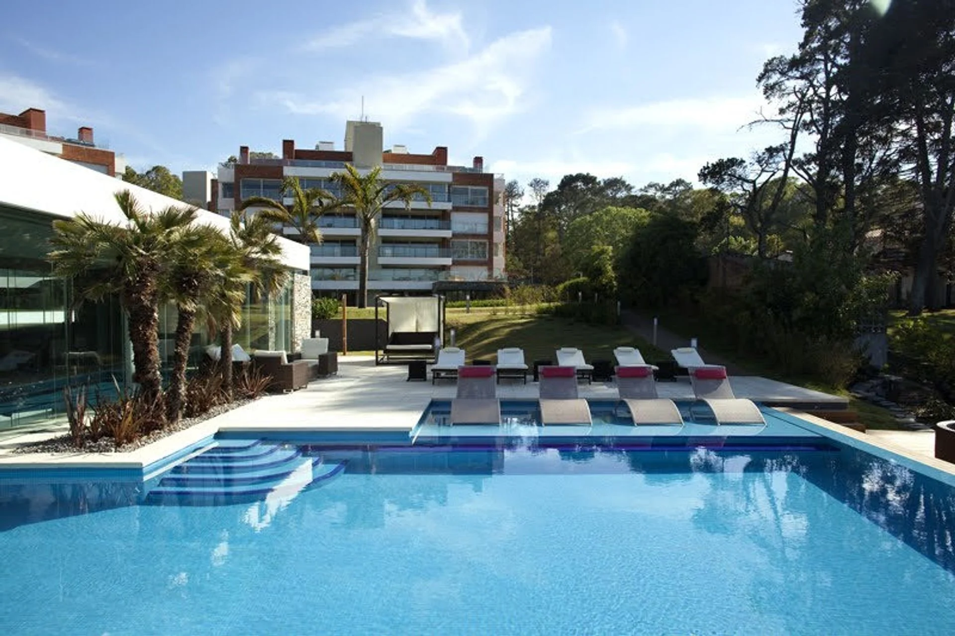 Amenities de primer nivel: piscina exterior, piscina interior climatizada, gimnasio con personal trainer, sauna, jacuzzi, sala de masajes, playa de arena con acceso al lago, y gran barbacoa de uso común. Servicio de mucamas opcional, lavadero de auto opcional. Estacionamiento de cortesia