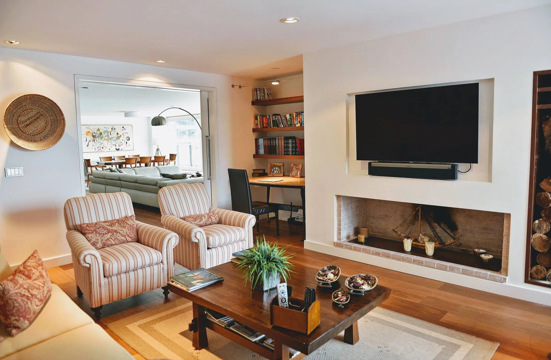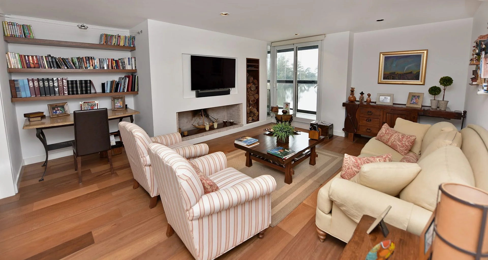 Amplio estar con estufa a leña y vista al lago.
