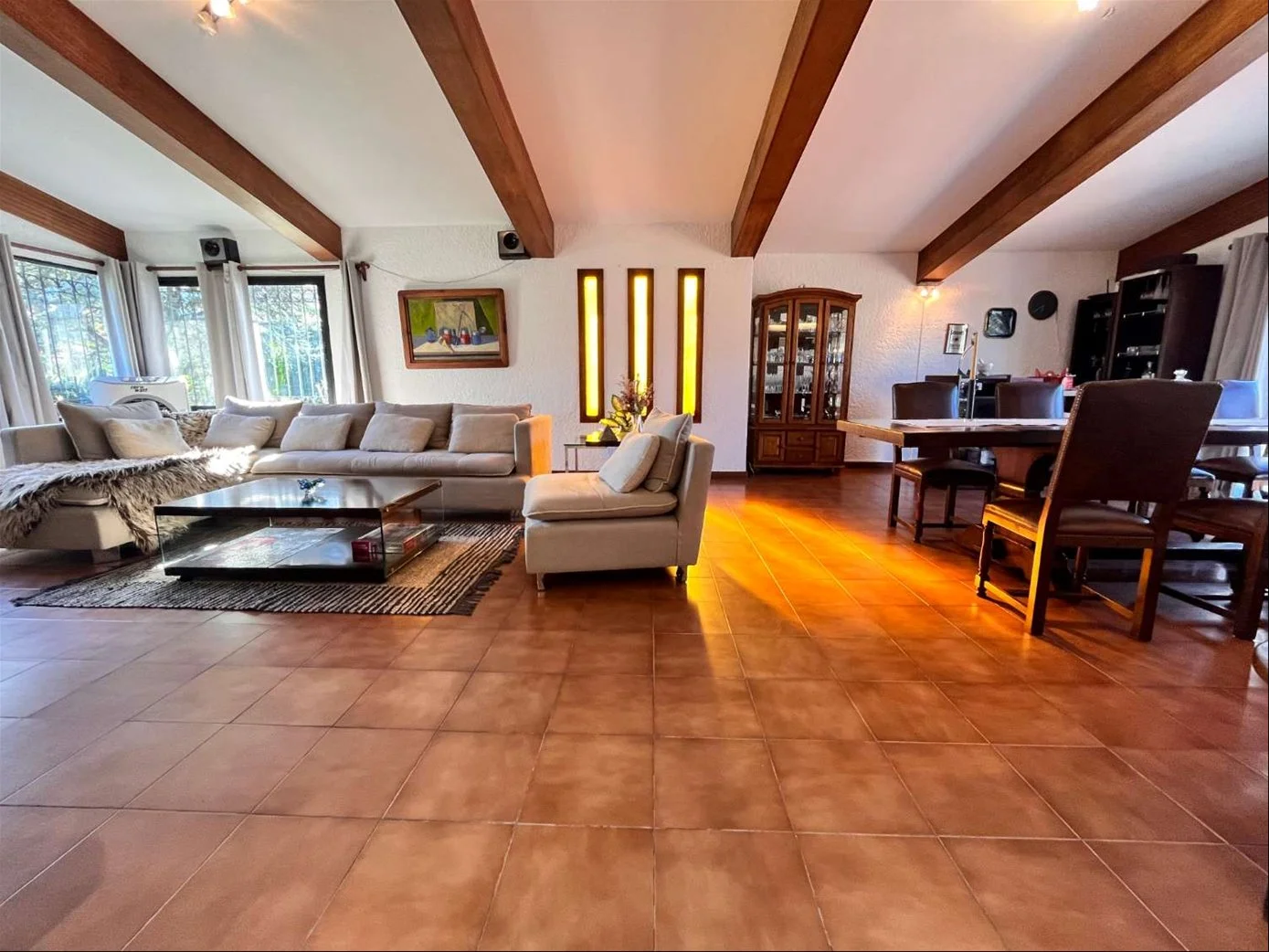 •Amplio living comedor con gran ventanal, vidrios dobles, rejas y estufa a leña de alto rendimiento con circulación de aire