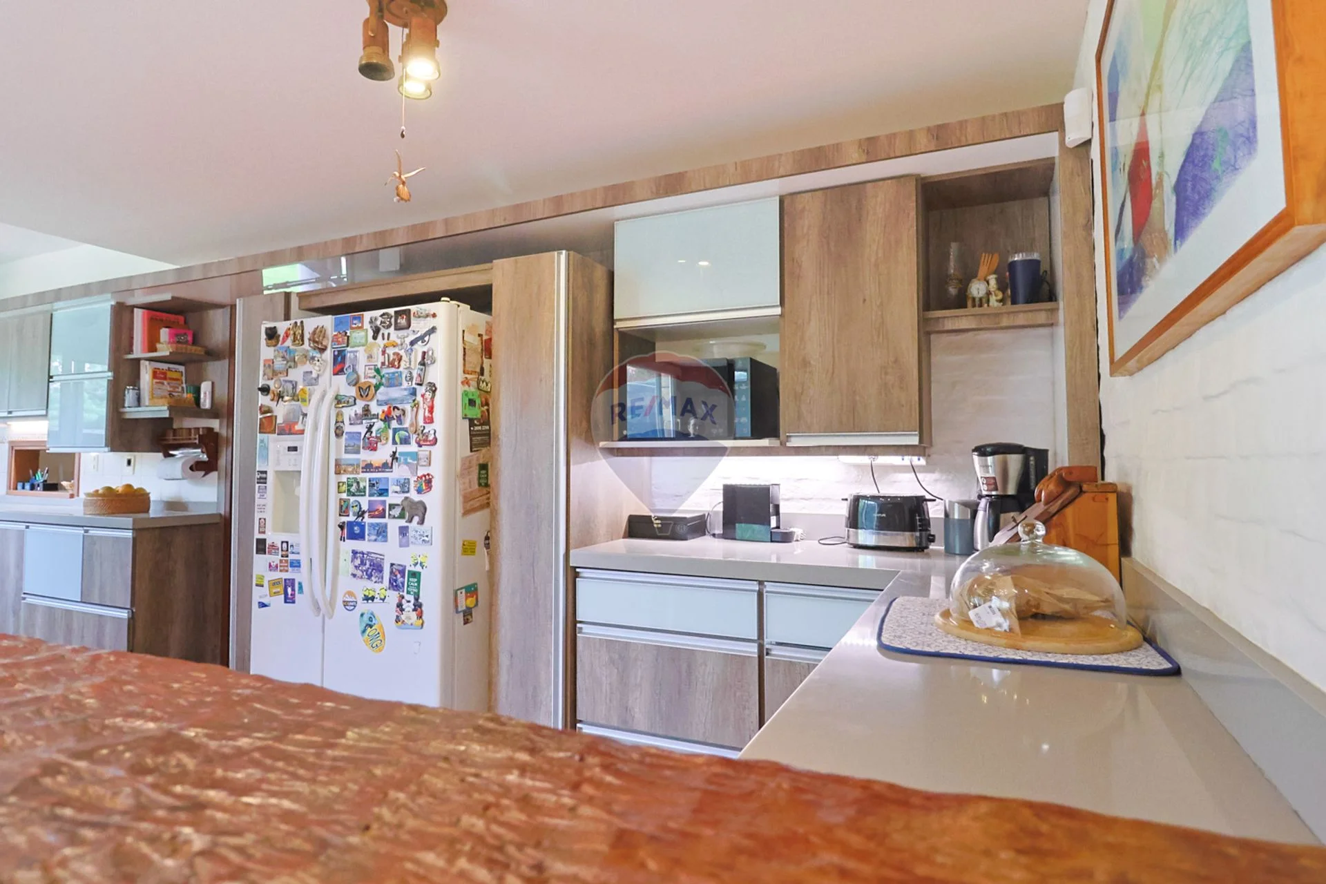 Cocina con doble mesada y gran diseño de placares a medida con comedor diario.