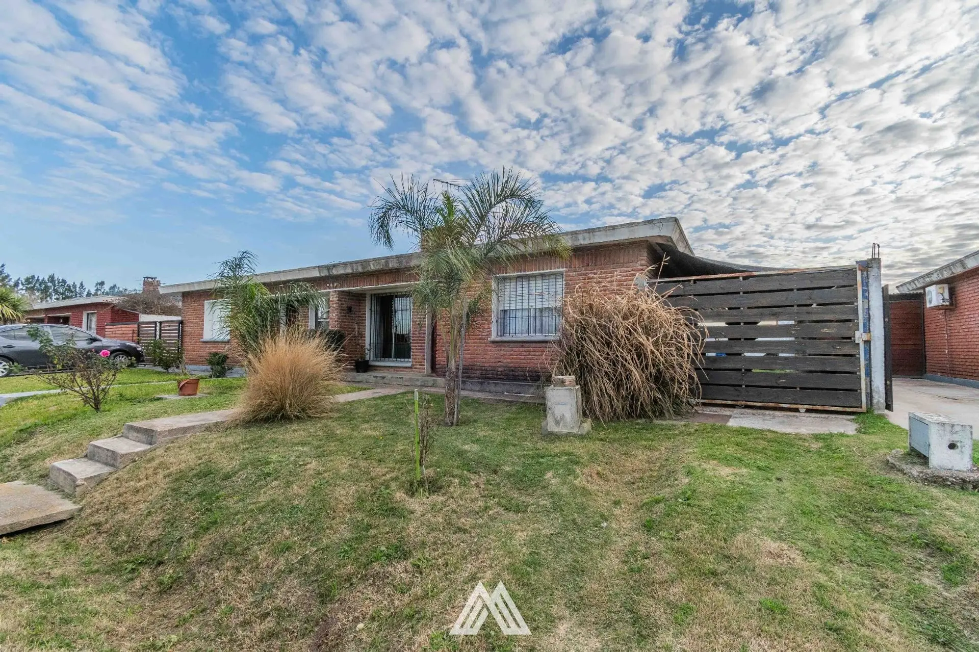 La casa es de ladrillo visto, techo de planchada con tejas americanas grises.