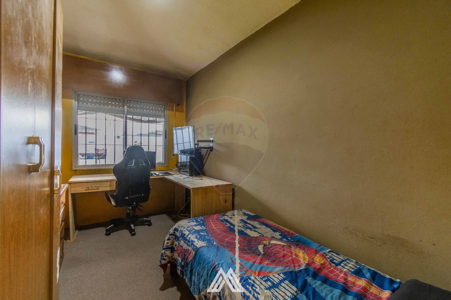 Cochera cerrada con portón de madera que se comunica con amplio fondo verde, totalmente cercado con muros.