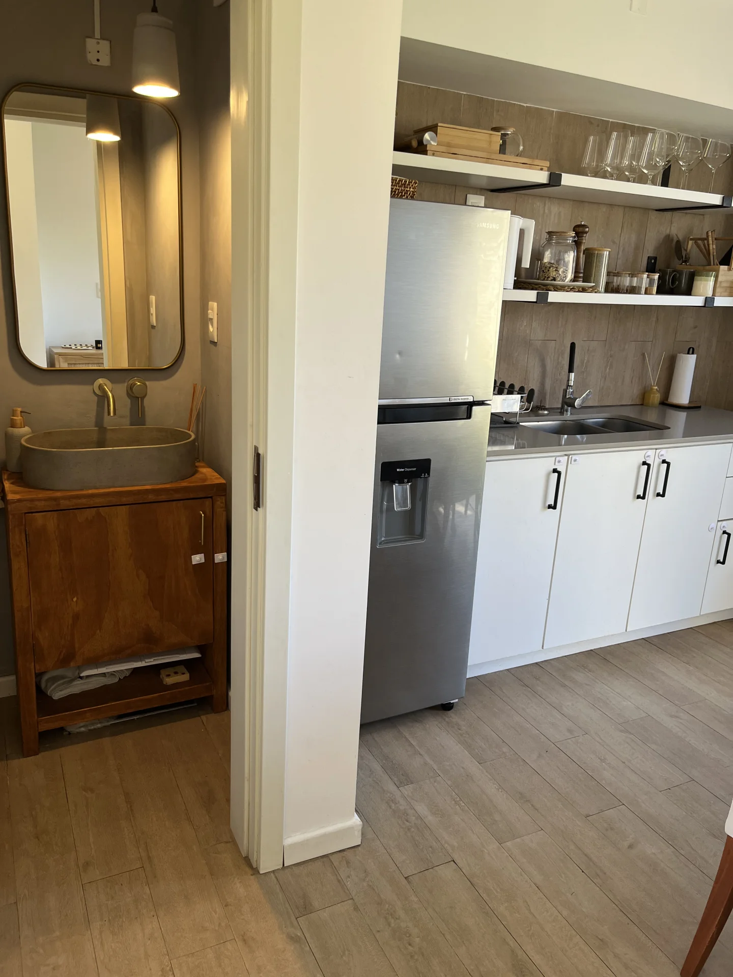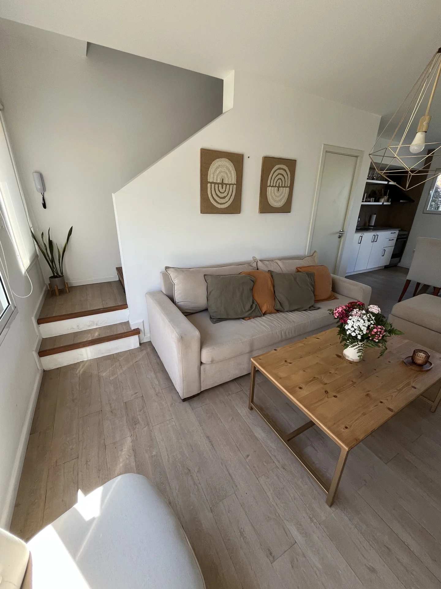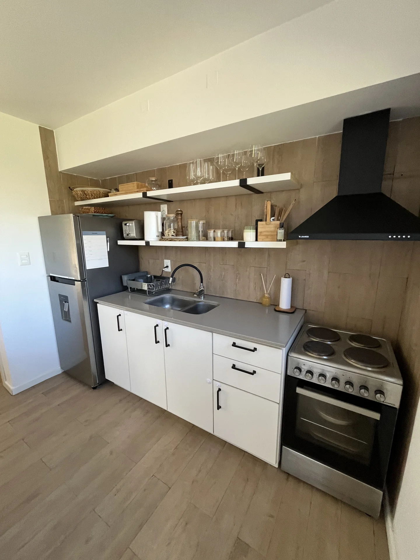 -Living comedor muy luminoso con cocina integrada. Salida al Patio por ventanal.