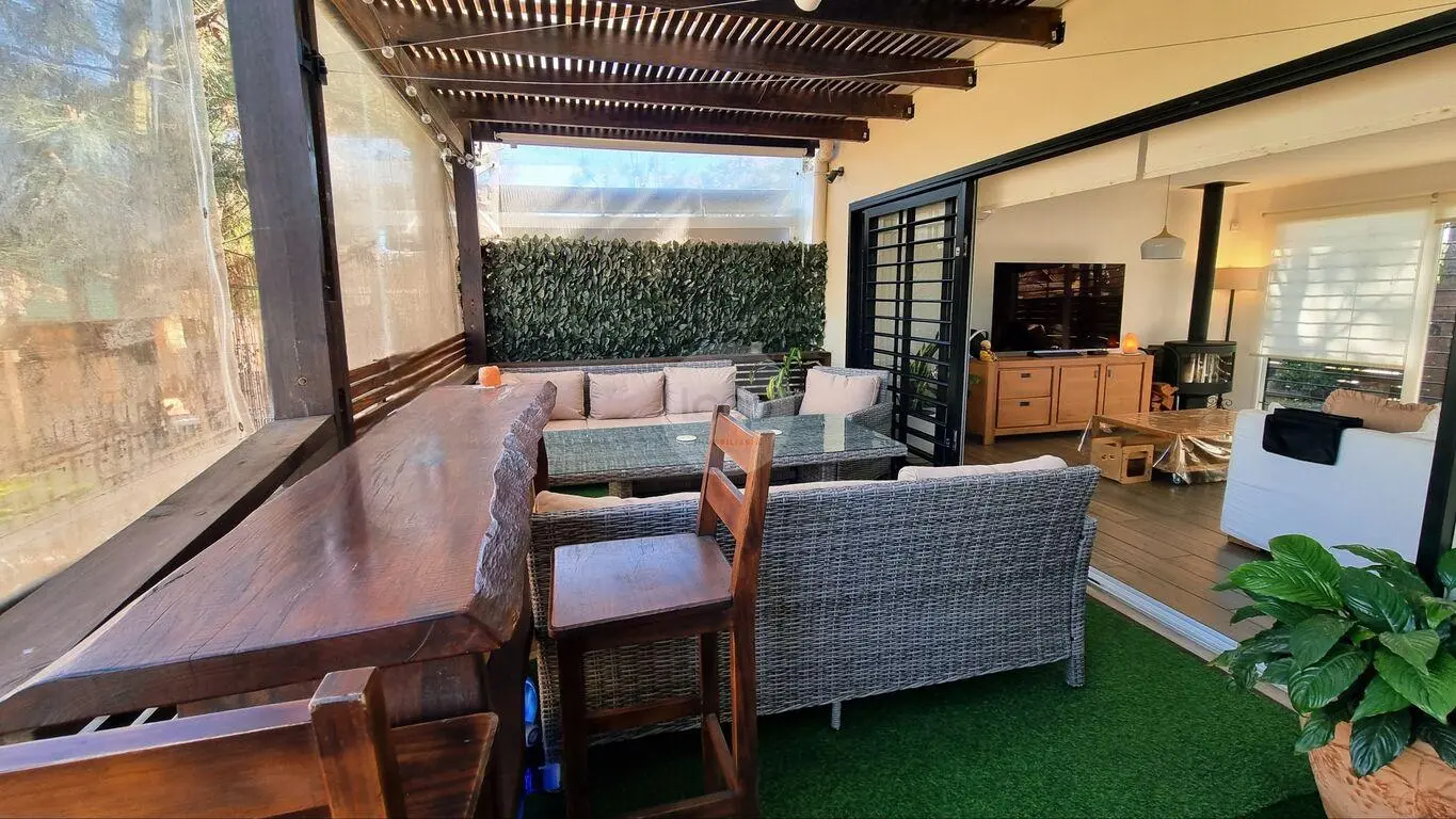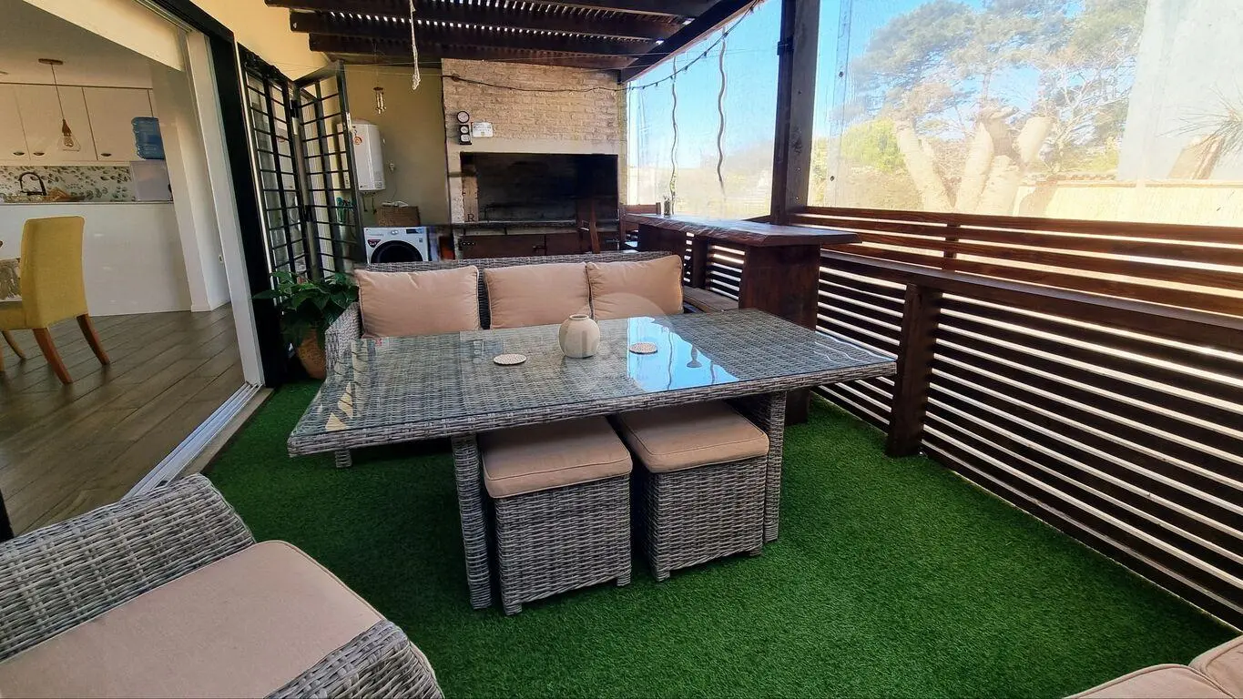 Retiro lateral muy disfrutable con fogón y espacio infantil. Fondo con zona de parrillero techado integrado a la casa.