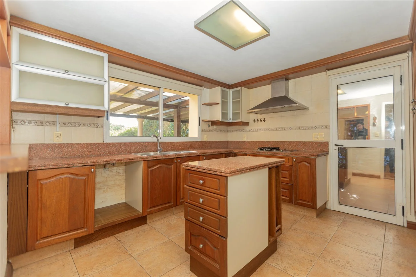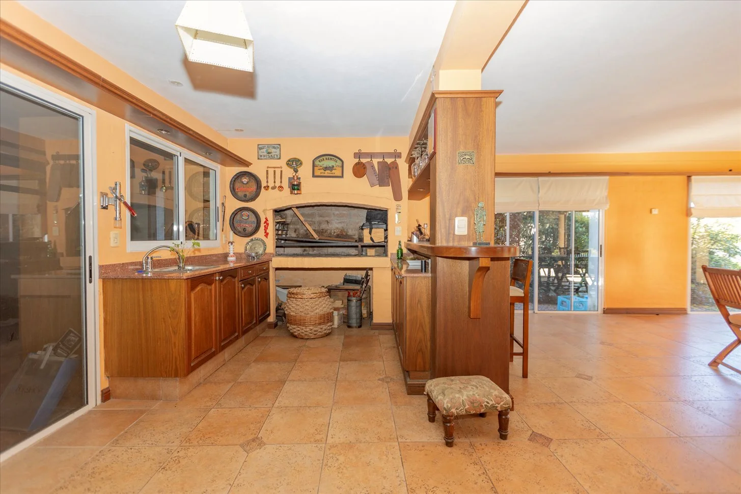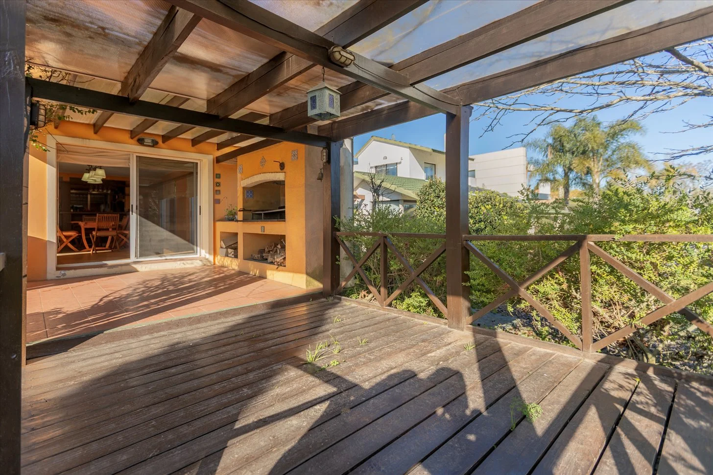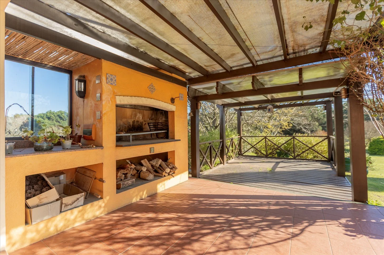 La cocina completa con isla se comunica con entrada lateral con cochera abierta para al menos cuatro vehículos o galería disfrutable en verano. Desde la barbacoa cerrada se accede a amplio patio con pérgola de madera, otro parrillero y espacio para estar y comedor disfrutable en días de sol, junto con el amplio jardín cerrado por vegetación.