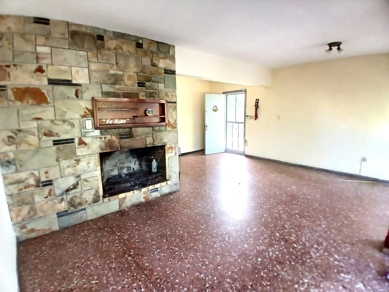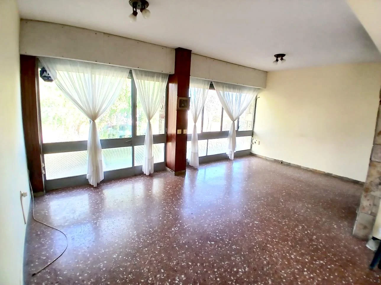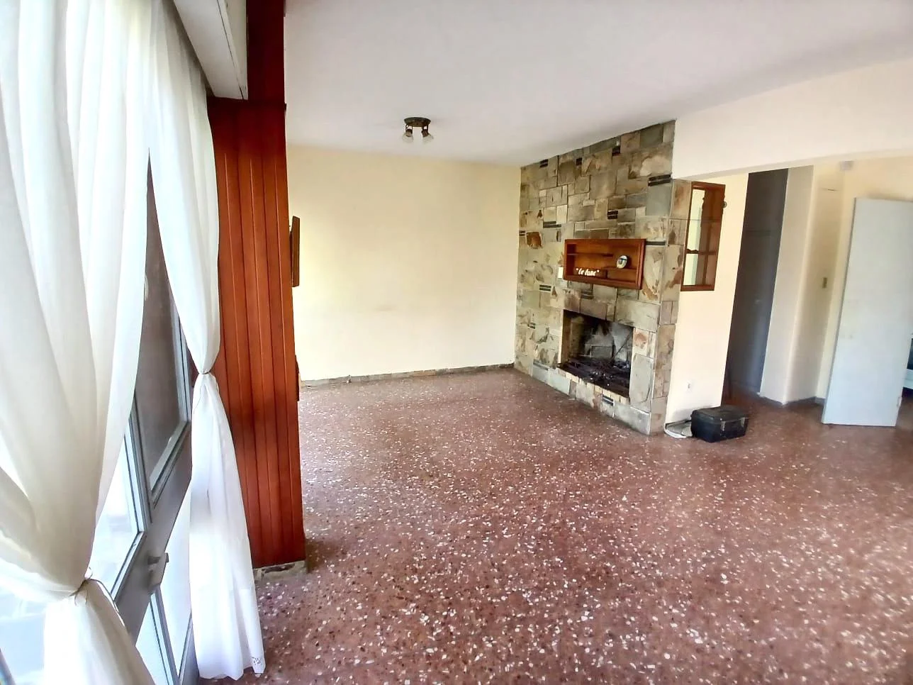Gran living comedor con hermosos ventanales con persianas de cerramiento motorizado, las aberturas son de hierro en muy buen estado de conservación, además una muy linda estufa a leña.