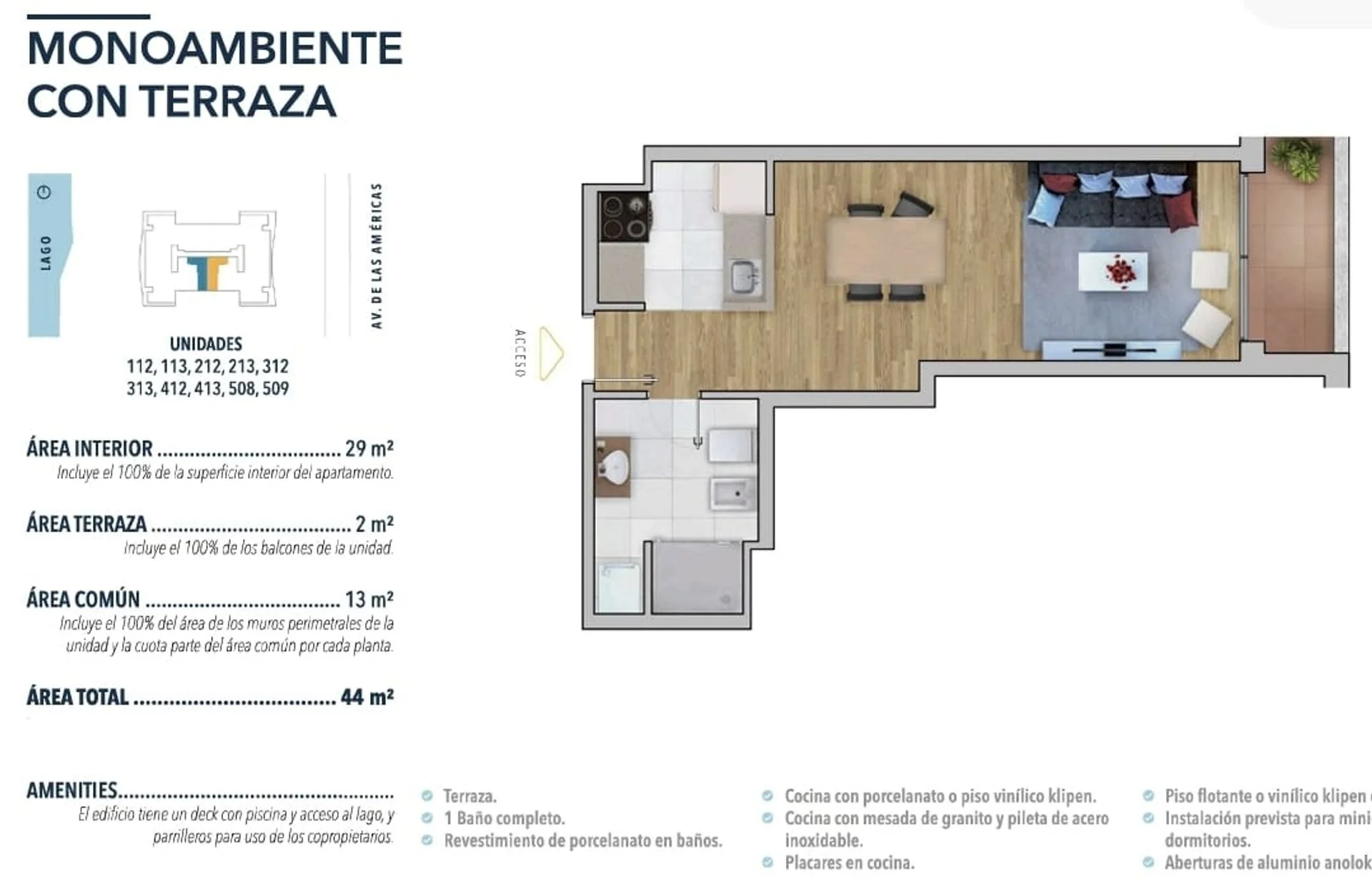 Venta de monoambiente con balcón en piso 4 en Edificio a estrenar Américas Uno frente a Avenida de las Américas y lago