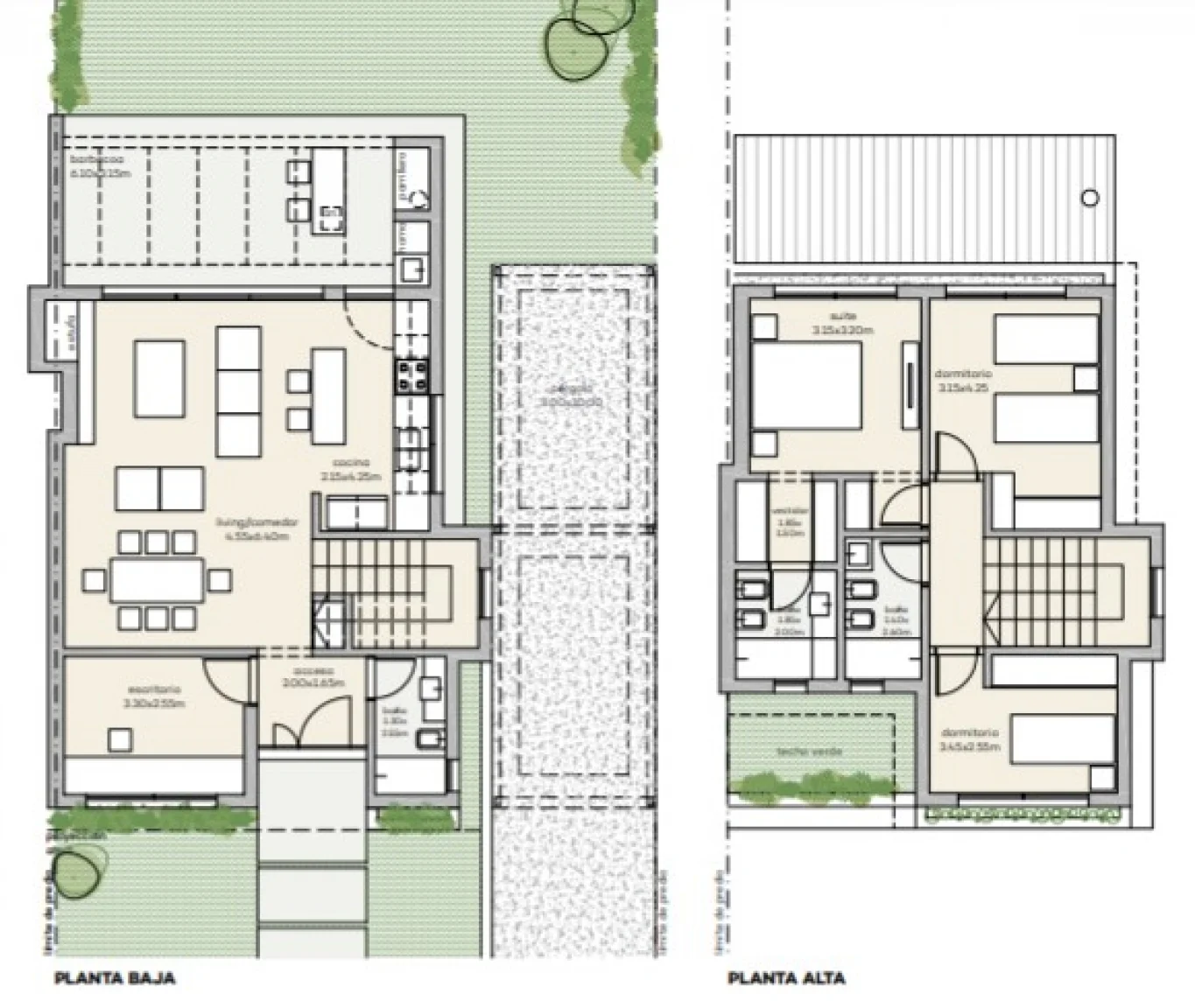 Living comedor con cocina integrada, toilette. Escritorio o estar en planta baja. 3 dormitorios en planta alta, 2 con un baño y principal en suite con vestidor.