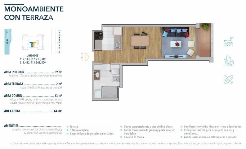 Se conforma por 7 niveles con 65 unidades, que van desde monoambientes hasta apartamentos de 4 dormitorios, algunos con jardín o dúplex con vista al lago.