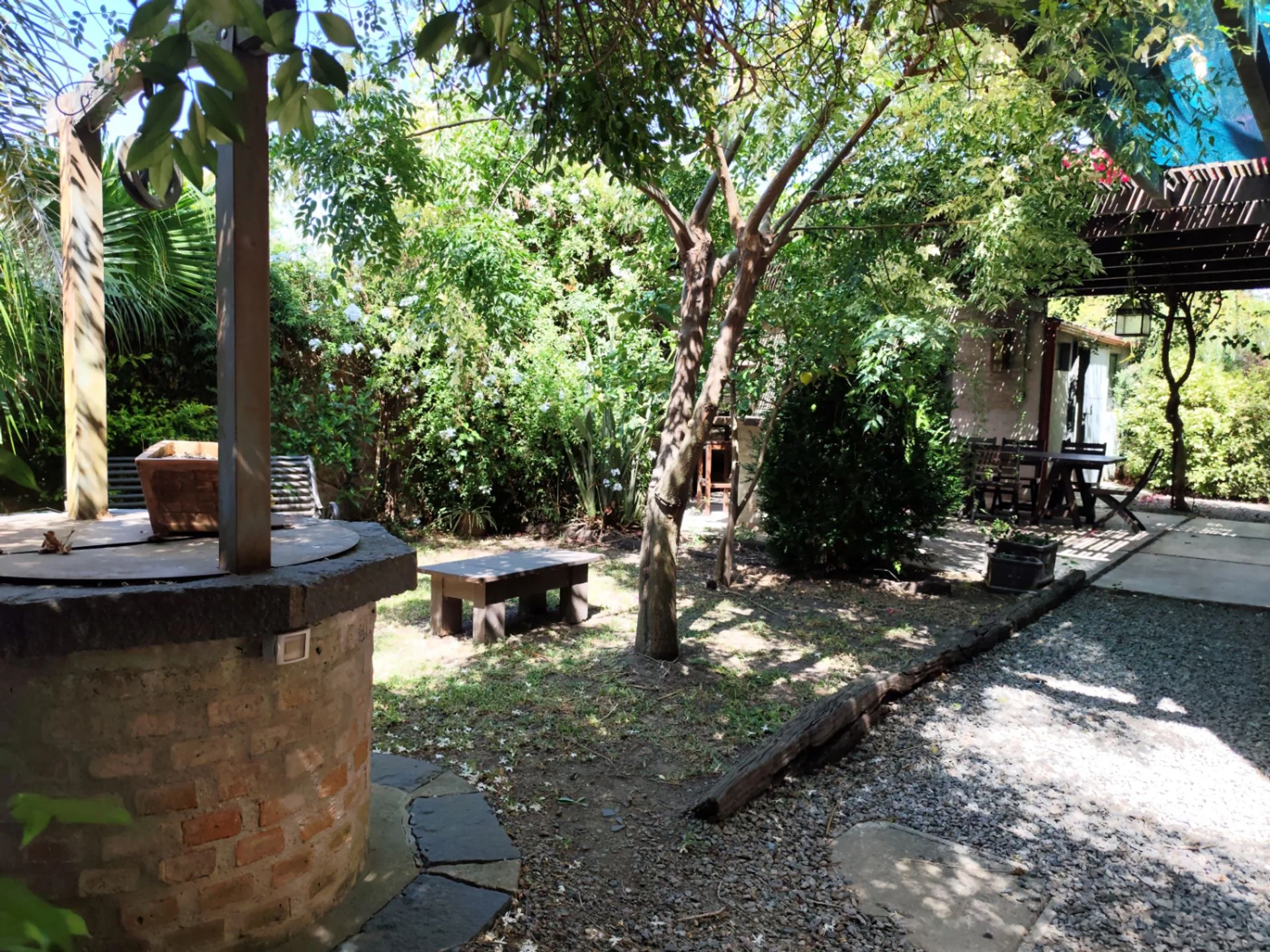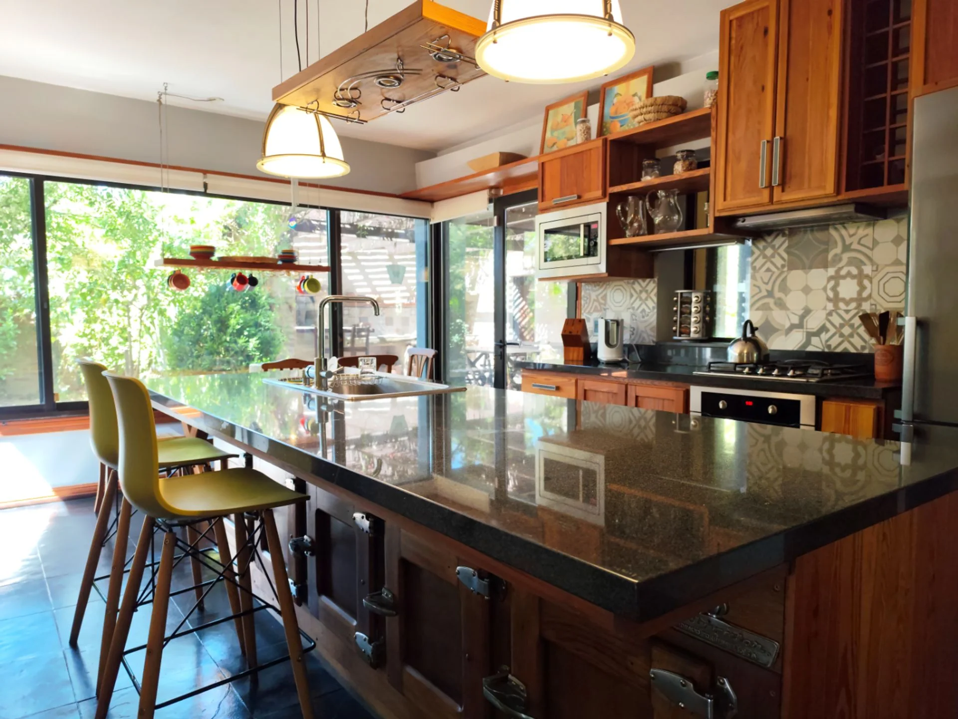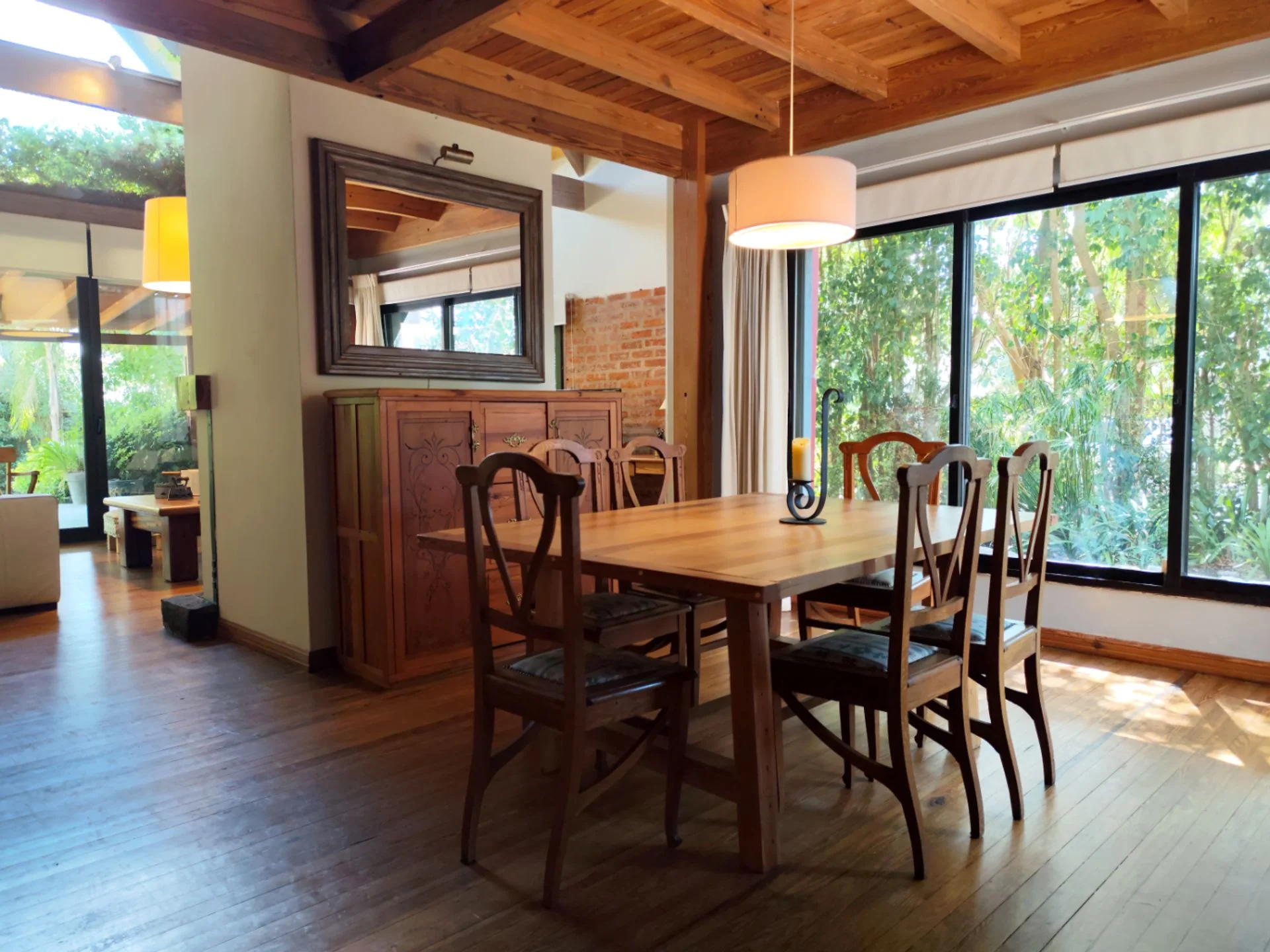 Construida en material tradicional, con ladrillos a la vista, techos de loza y detalles en pinotea, ofrece una calidez única en cada ambiente. Sus amplios ventanales bañan de luz natural todos los espacios, creando una sensación de amplitud y conexión con el entorno verde.