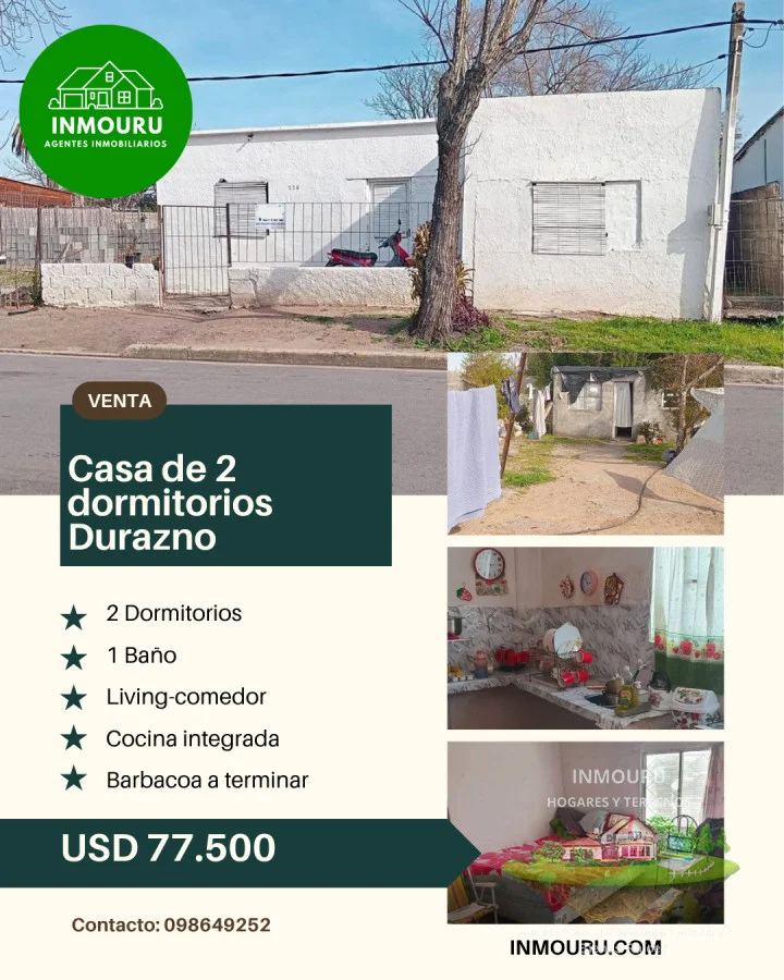 Se vende casa de 2 dormitorios en Durazno, ubicación aproximada 25 de Agosto, esq. Fray Generoso Perez.