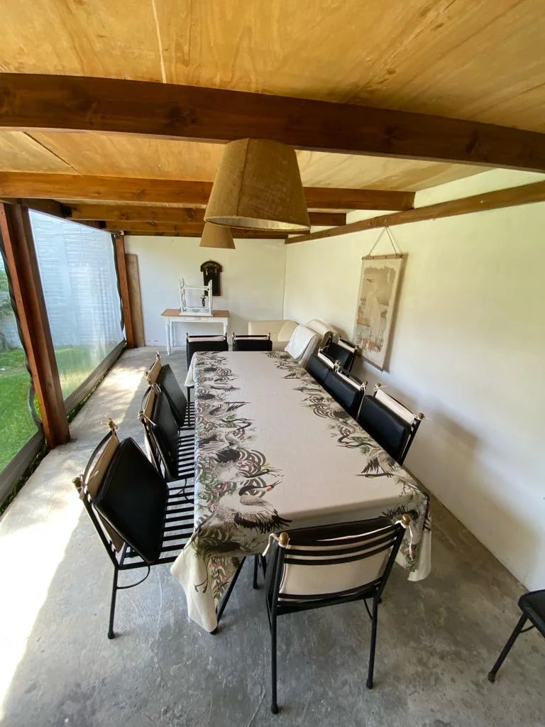Parrillero techado con cerramiento vinílico, espacio de estar y comedor exterior con mesa para 12 personas