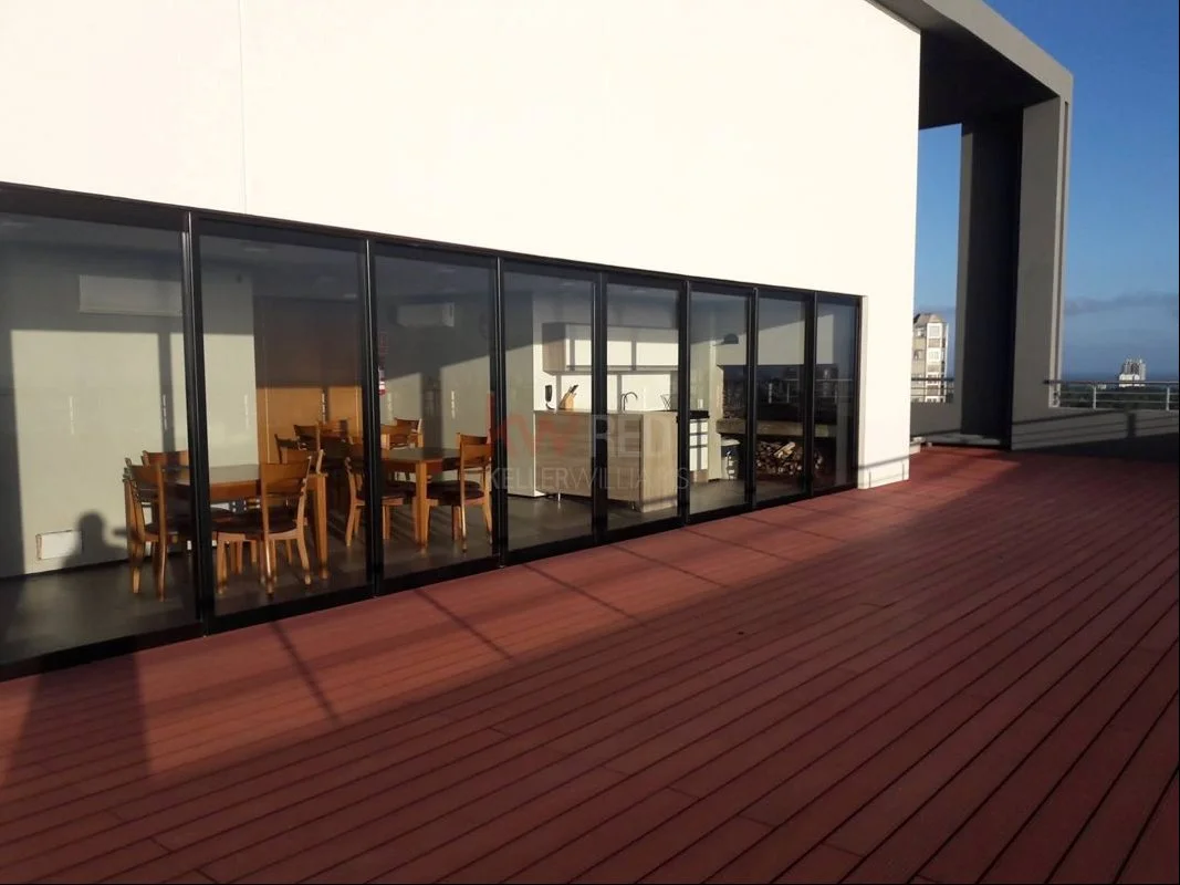 Parrilleros totalmente equipados en el piso superior con vistas panorámicas al mar y al atardecer.