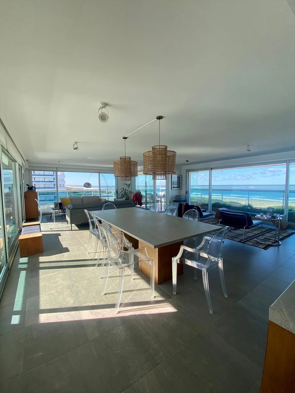 Amplio living comedor con mucha luz natural y una vista increíble al mar.