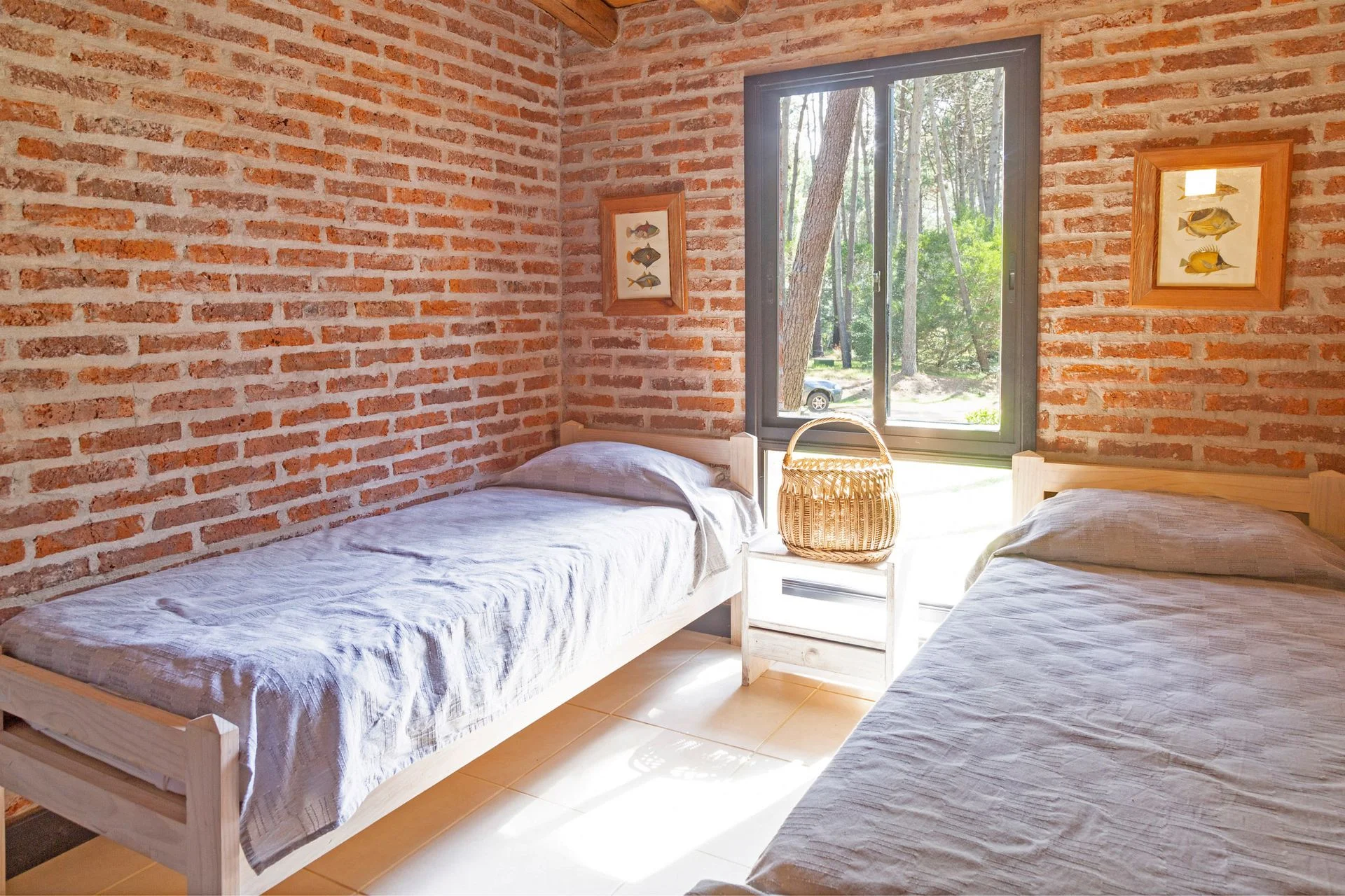 Moderna casa diseñada por el Arq. Dieste,con muy buena distribución, amplio living comedor con hogar a leña, toilette, estar en medio piso con escalera volada, con vista al bosque, parrillero techado junto a la casa como continuación del comedor, el ala este de la casa posee 2 suite más 2 dormtorios con un baño, todos con placares, AA en el living y en las 2 suites.