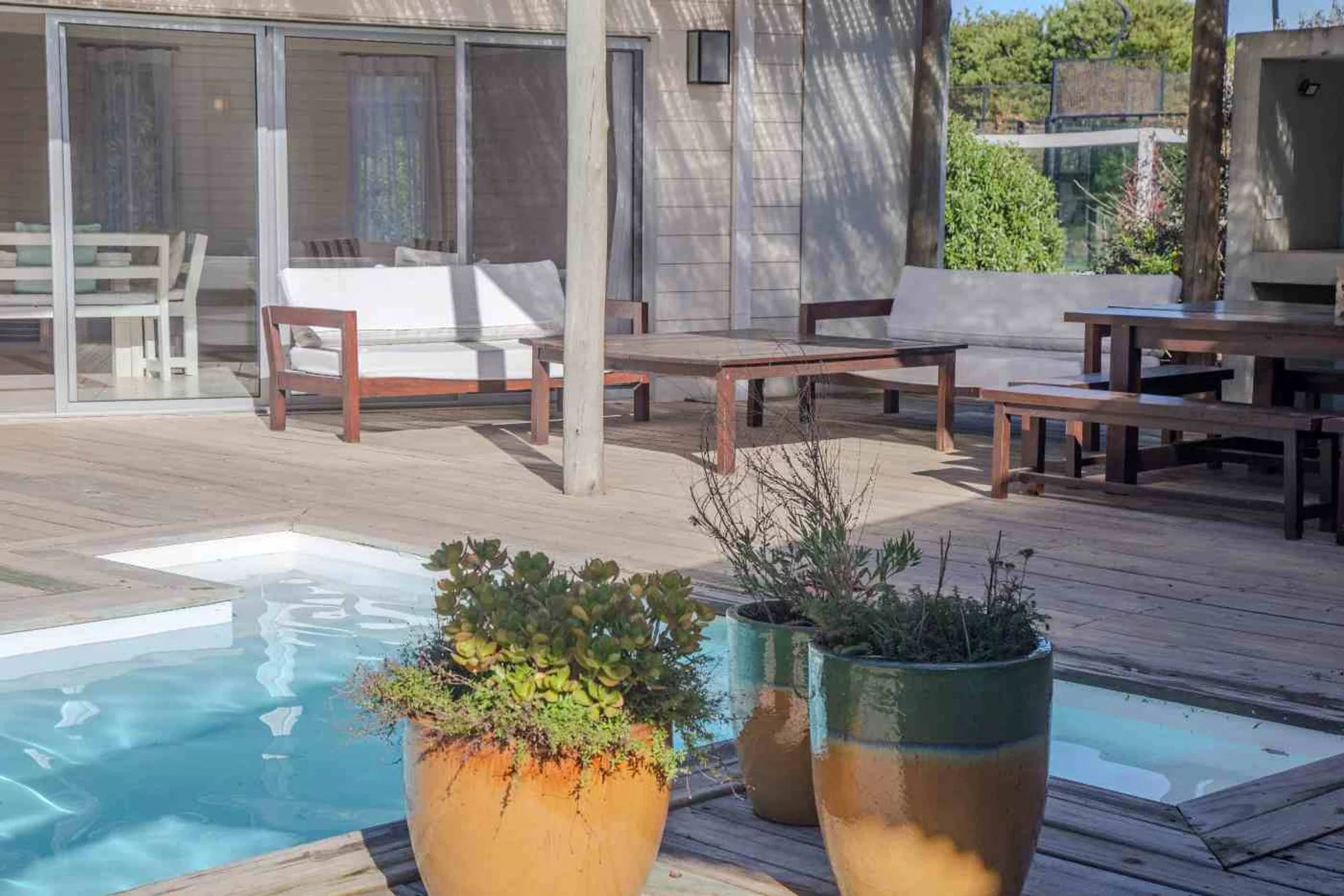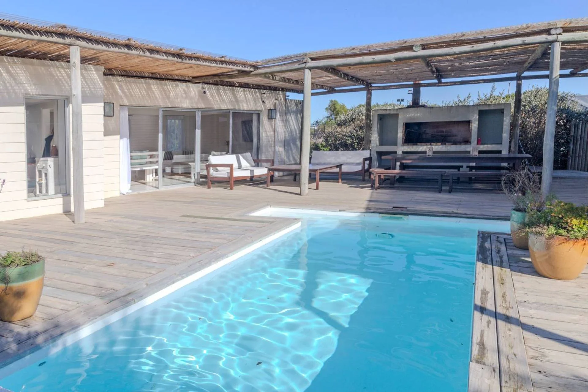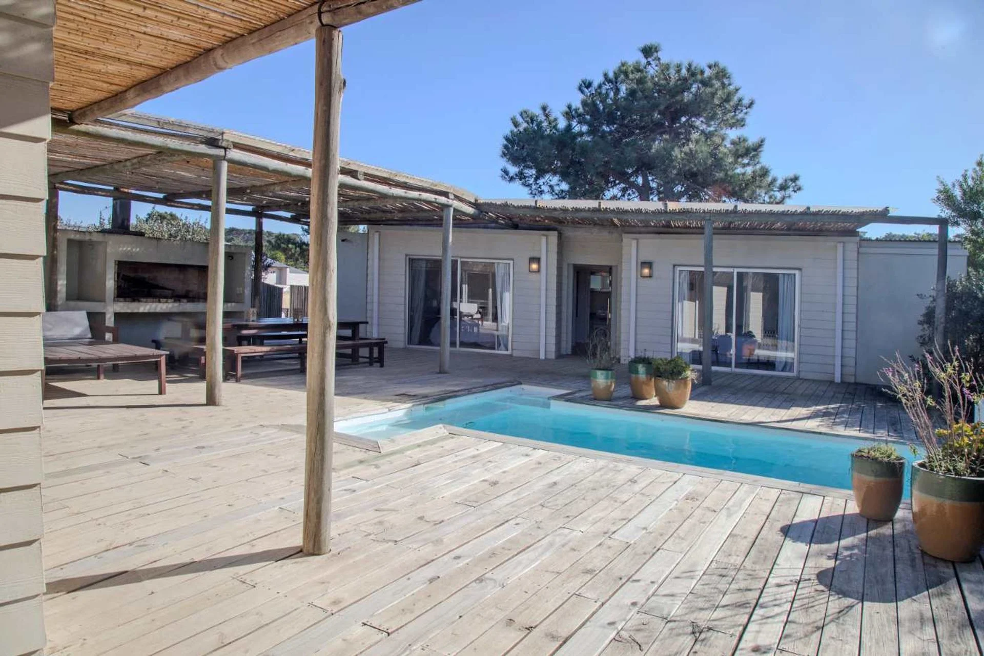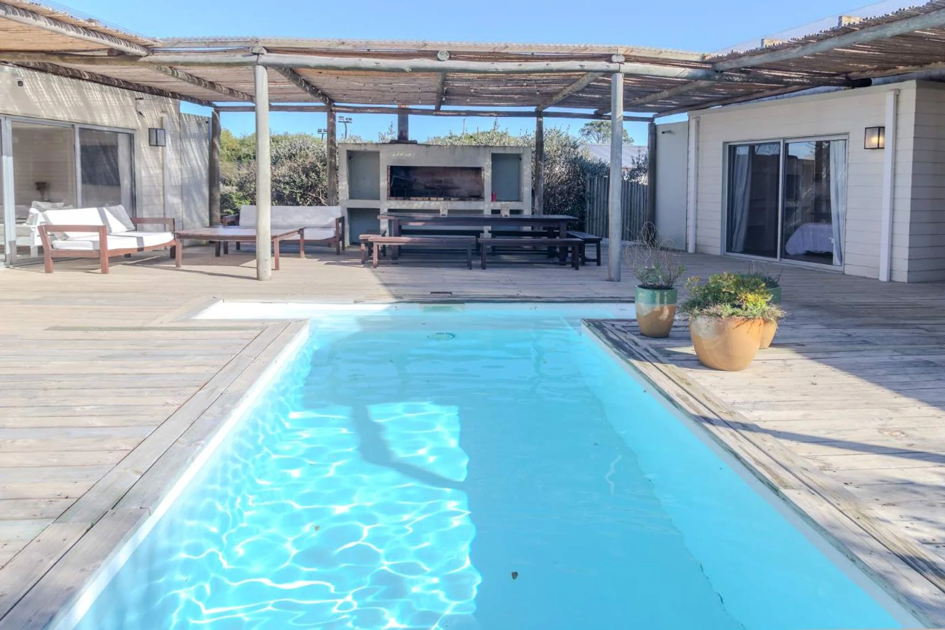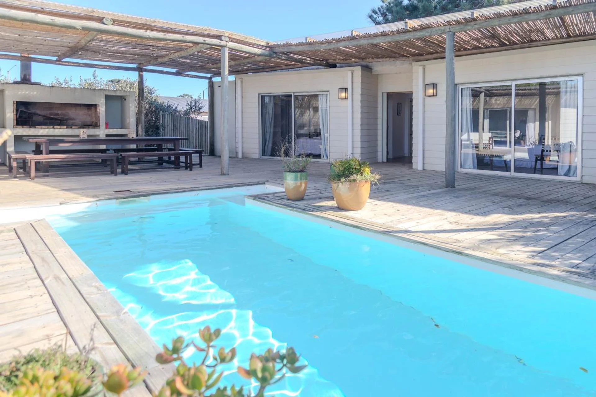 Cómoda casa en 2 bloques que convergen hacia la piscina y solarium, 1 bloque tiene 4 dormitorios, 2 en suite y 2 comparten un baño en hall de distribución, la piscina y barabacoa amplia al medio y en el segundo bloque tenemos un amplio living comedor, con cocina definida muy bien equipada, decorado muy estival.