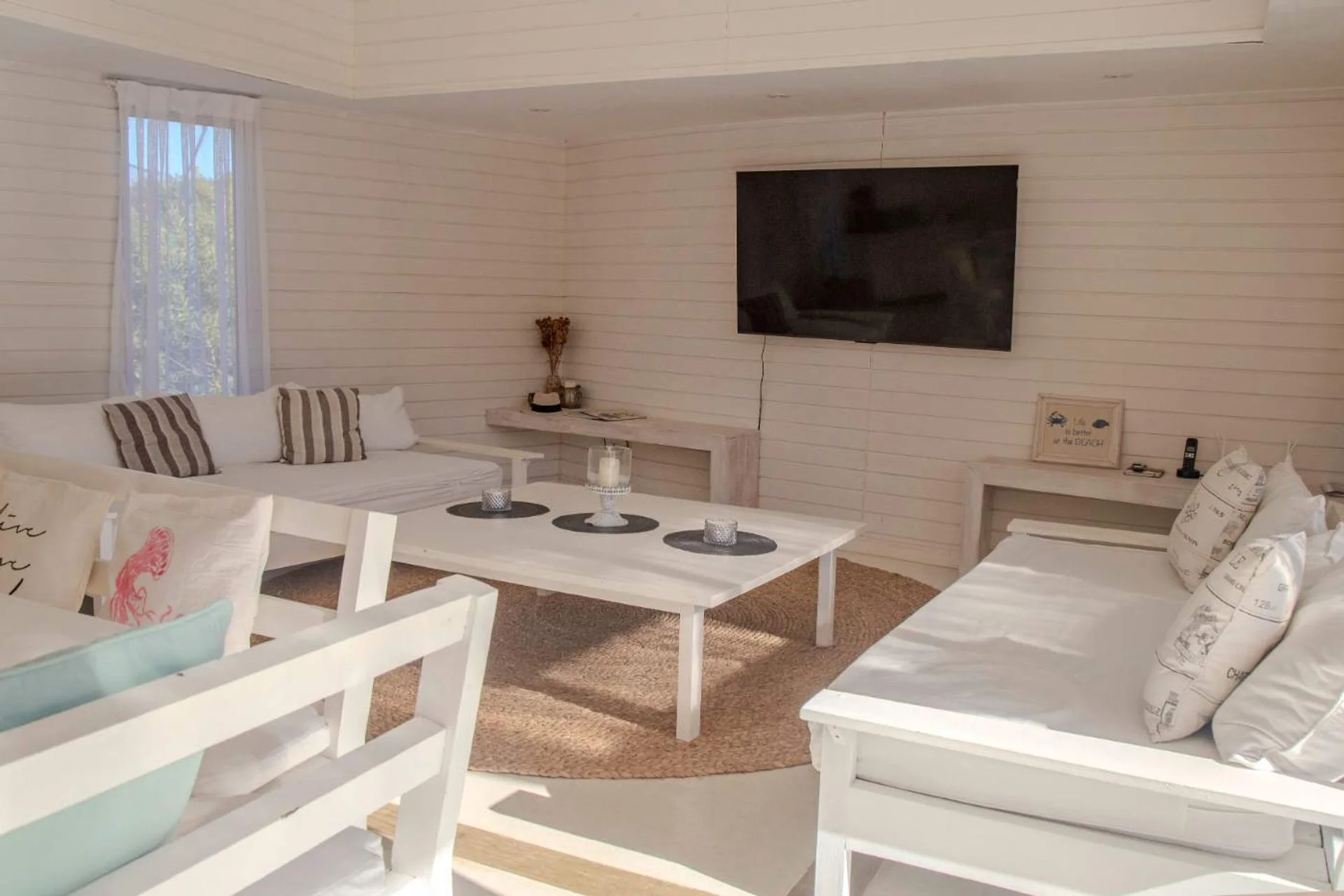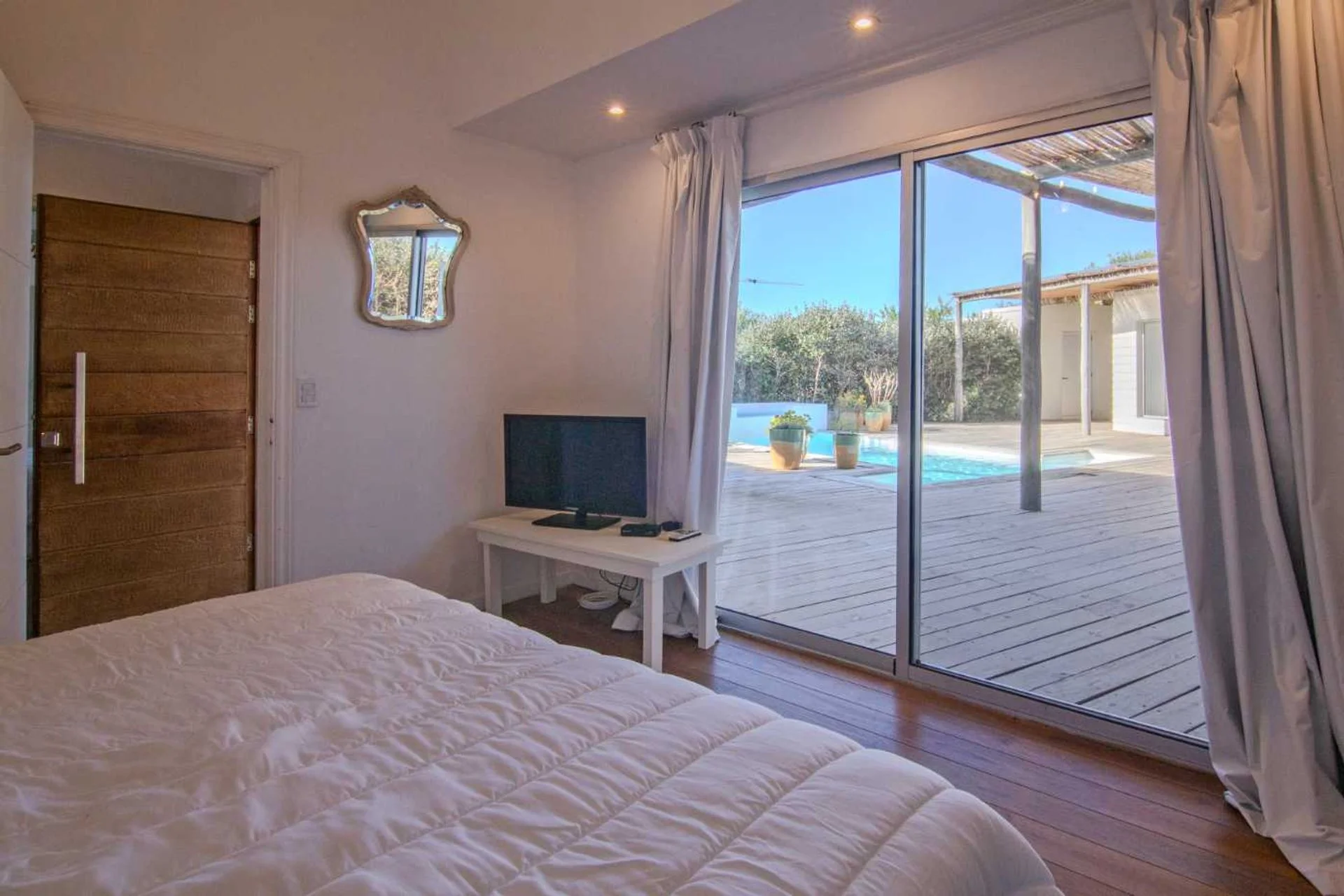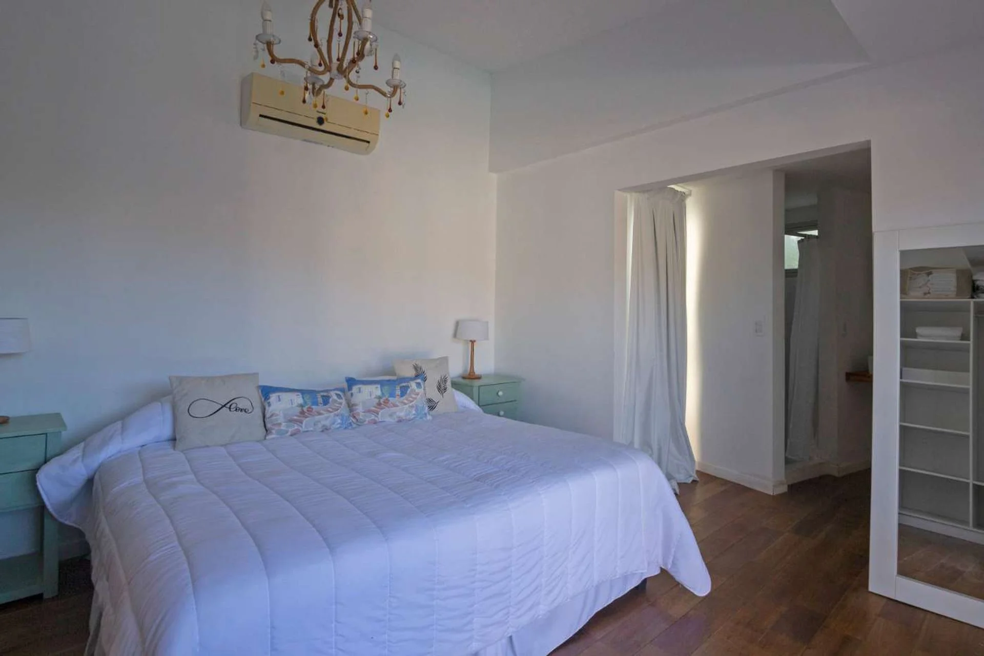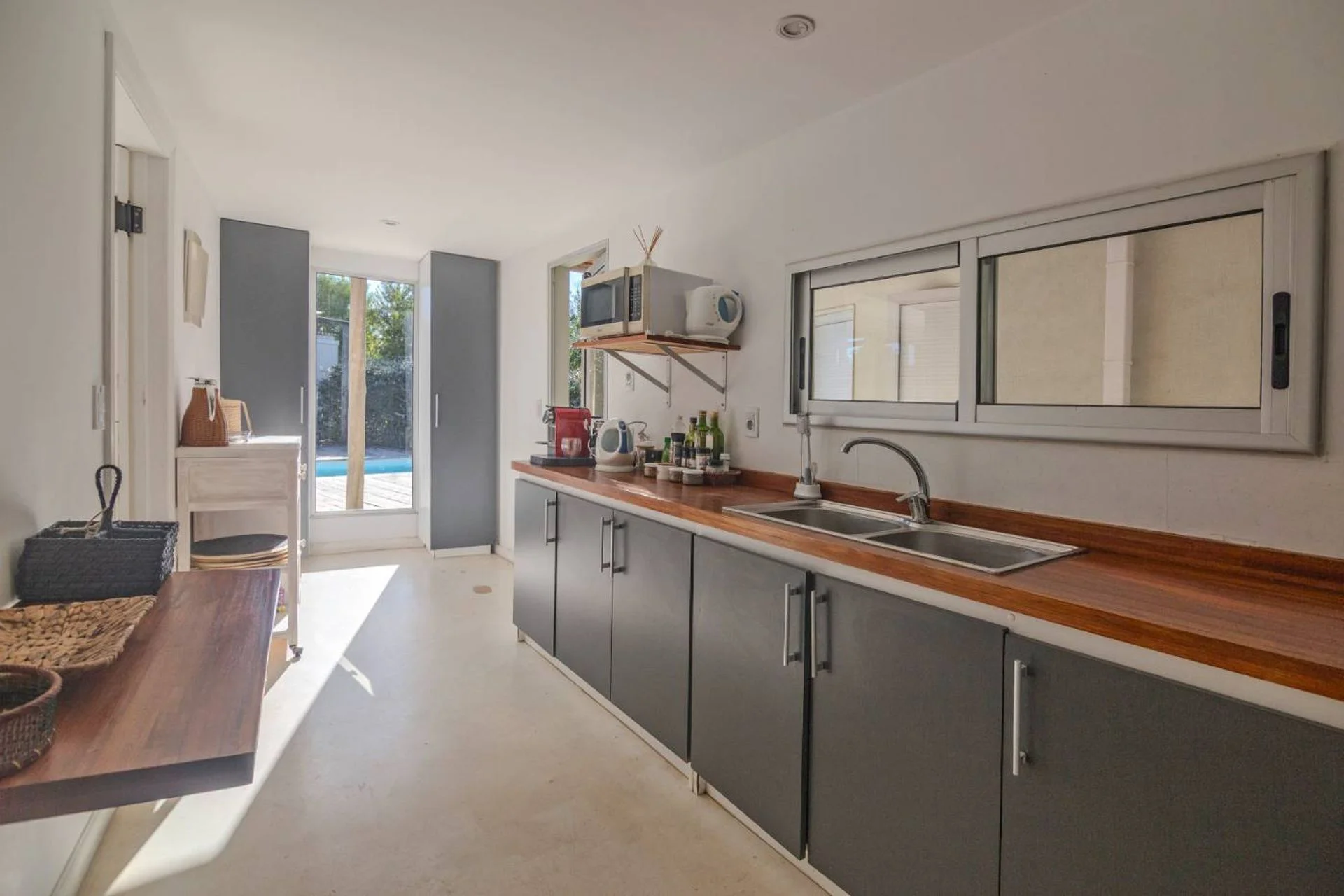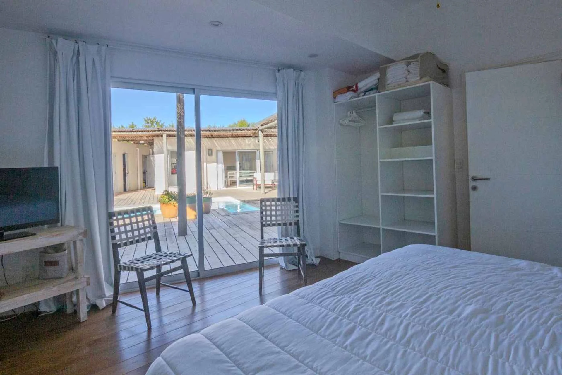 Cómoda casa en 2 bloques que convergen hacia la piscina y solarium, 1 bloque tiene 4 dormitorios, 2 en suite y 2 comparten un baño en hall de distribución, la piscina y barabacoa amplia al medio y en el segundo bloque tenemos un amplio living comedor, con cocina definida muy bien equipada, decorado muy estival.