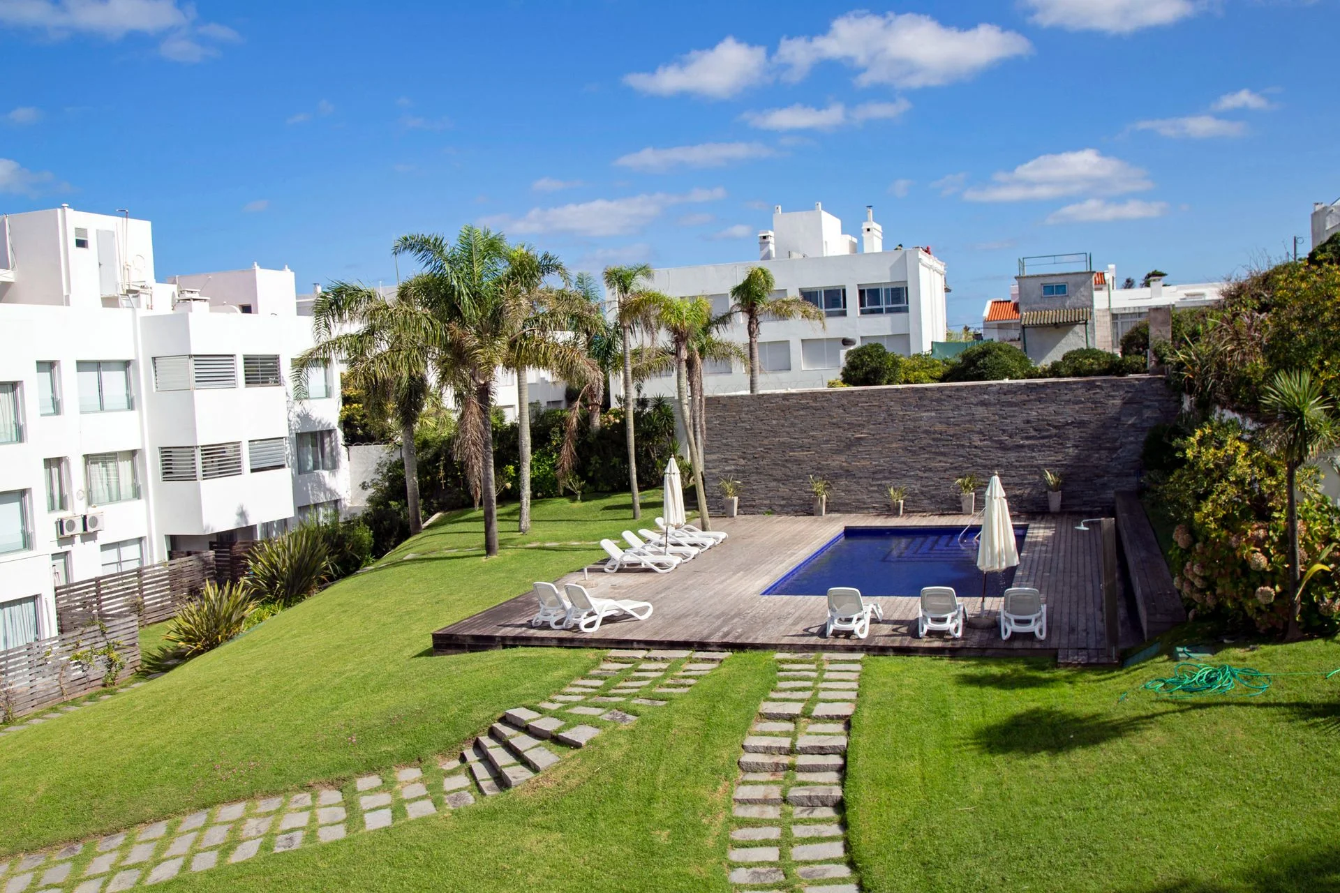 Acogedor apartamento de 2 suites, living comedor con cocina integrada muy equipada, patio cercado con salida al jardín, solarium y piscina. Ropa de cama, Wifi, TV Cable, servicio de mucama diario, recepción 24 horas, vigilancia por cámaras 24 horas, servicio de playa en temporada alta.
