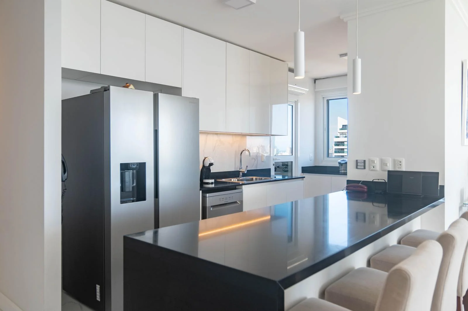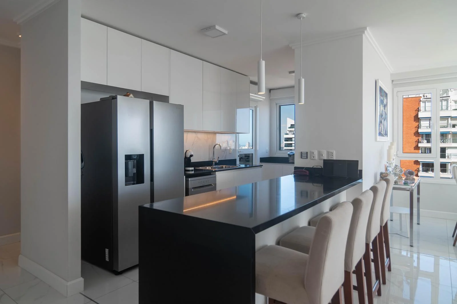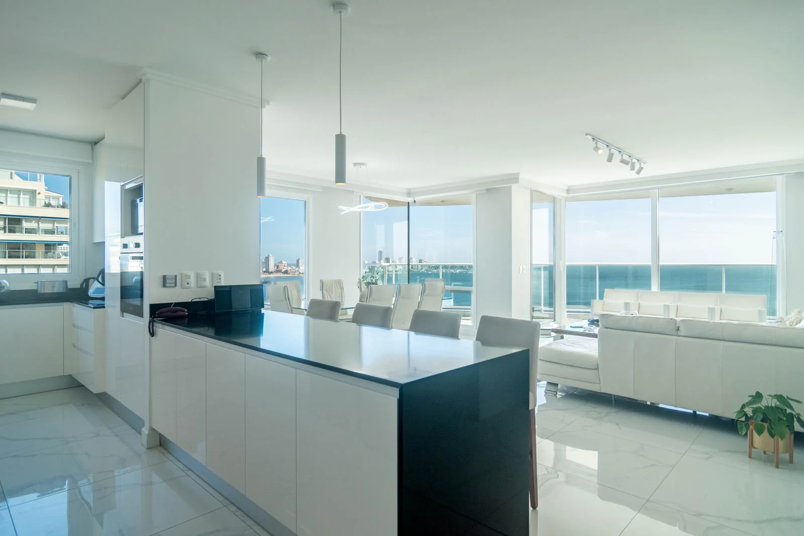 La cocina integrada con barra desayunadora está totalmente equipada, combinando diseño moderno y practicidad. El living-comedor, amplio y luminoso, ofrece un espacio acogedor para relajarse o recibir visitas tras un día de playa.
