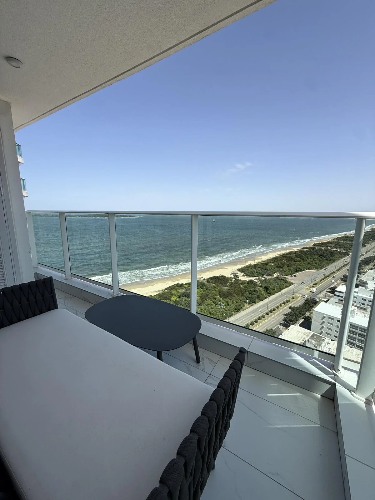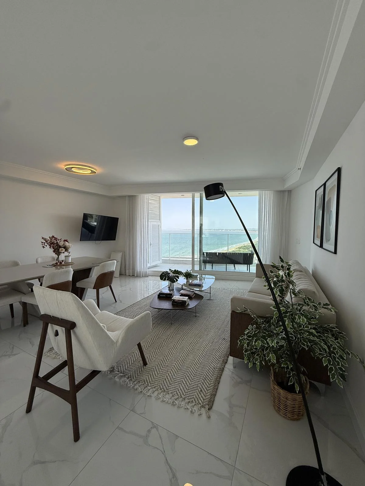 Sus amplios ventanales enmarcan una vista al atardecer única sobre la Playa Mansa, creando un ambiente cálido y sofisticado.