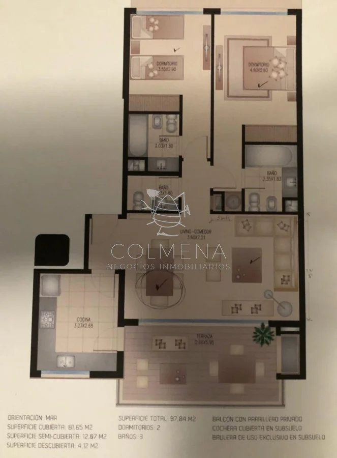 Apartamento de 2 dormitorios, 2 baños, 1 toilette, living-comedor, cocina, balcón con parrillero y cochera techada. Amenities, Servicio de porteria, mucama, piscina exterior, gimnasio y parrilleros comunes en el ultimo piso. Referencia Interna : Tera-10849