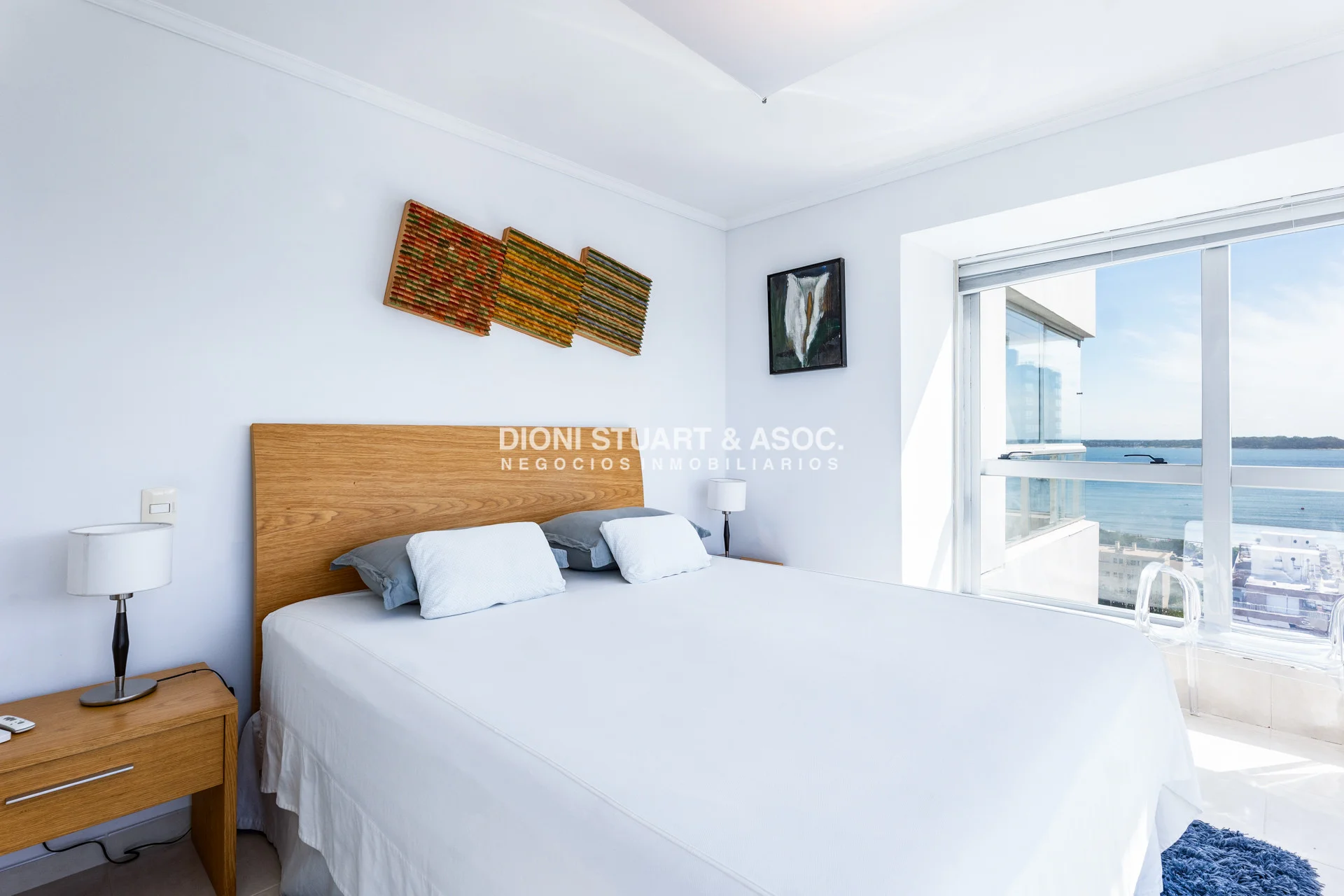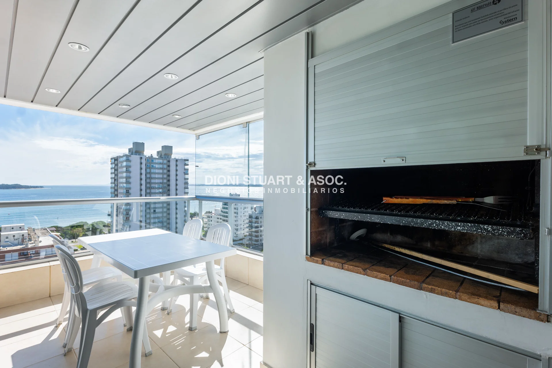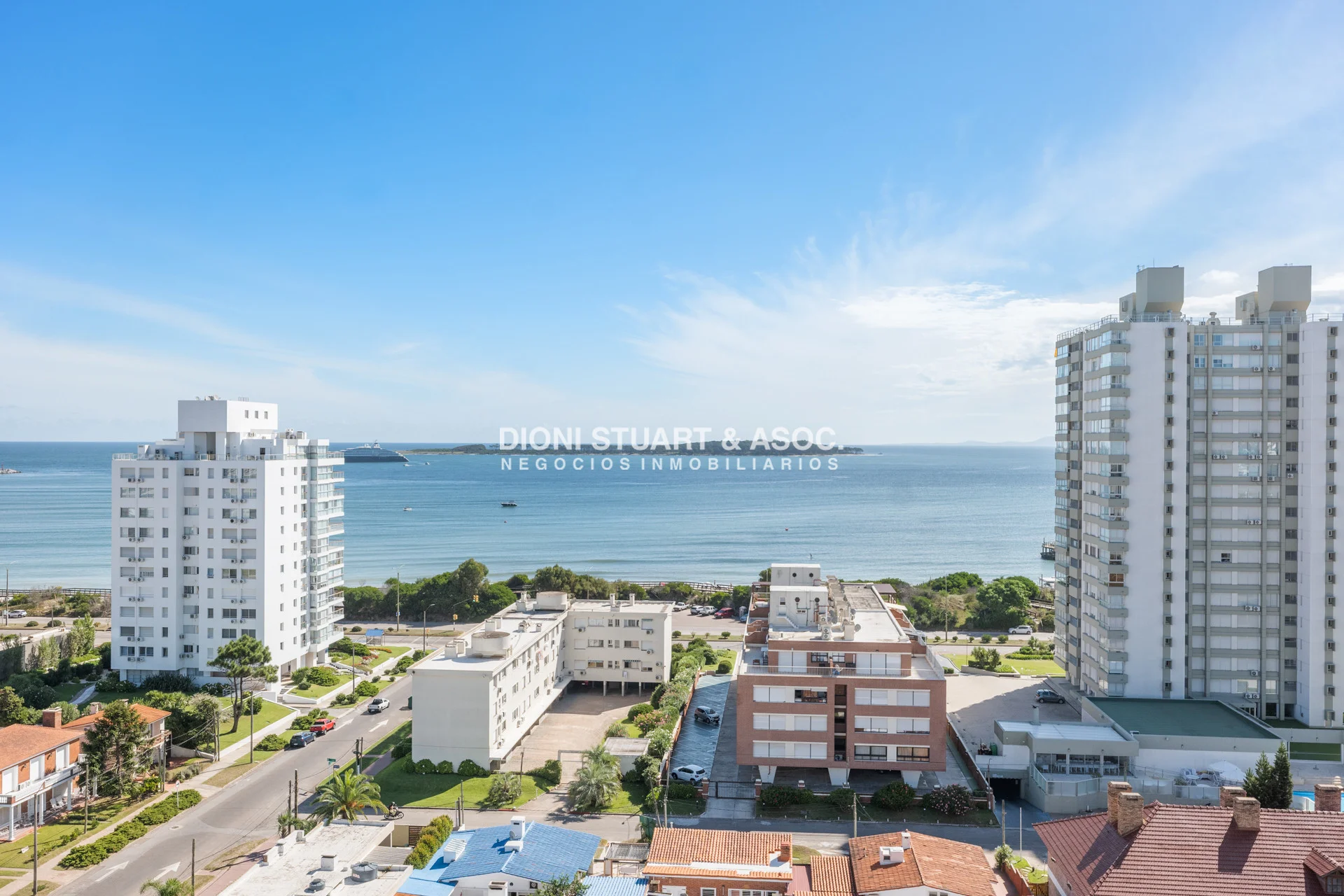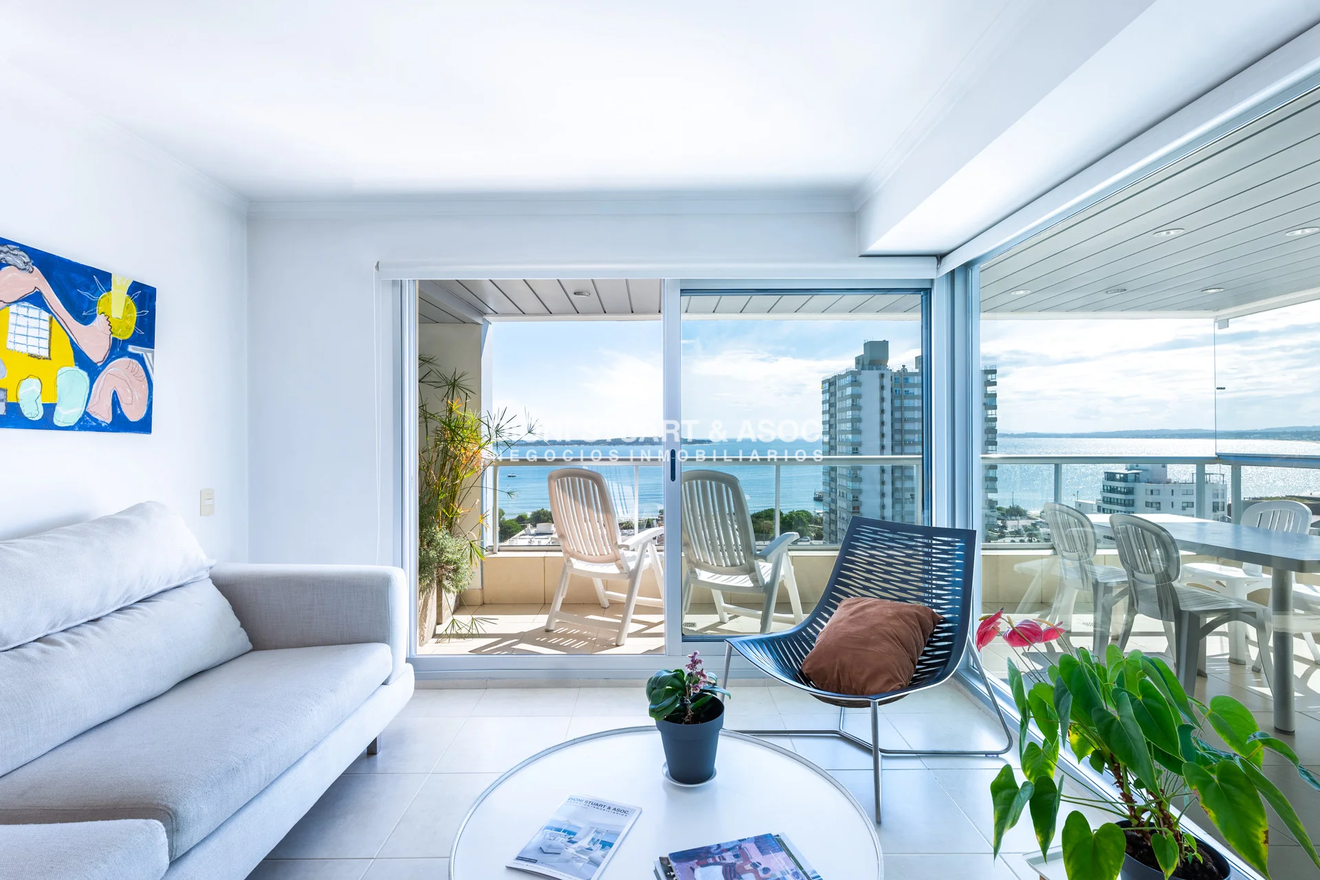 Apartamento esquinero, con un comodo living-comedor con una imponente vista al mar desde donde accedemos a una terraza balcón en forma de L con con parrillero y vista 180° desde Punta del Este a Punta Ballena. Cocina definida con lavarropas y lavavajillas, completamente equipada. Dos dormitorios y dos baños (principal en suite). El dormitorio principal esta orientado hacia el mar y es esquinado a Punta Ballena totalmente vidriado logrando asi recibir sol todo el día y haciendo de este un espacio ideal para el invierno por su climatización. De todas formas, la unidad cuenta con Aire en todos sus ambientes, loza radiante sectorizada, Rollers, Tv Smart, etc etc.
