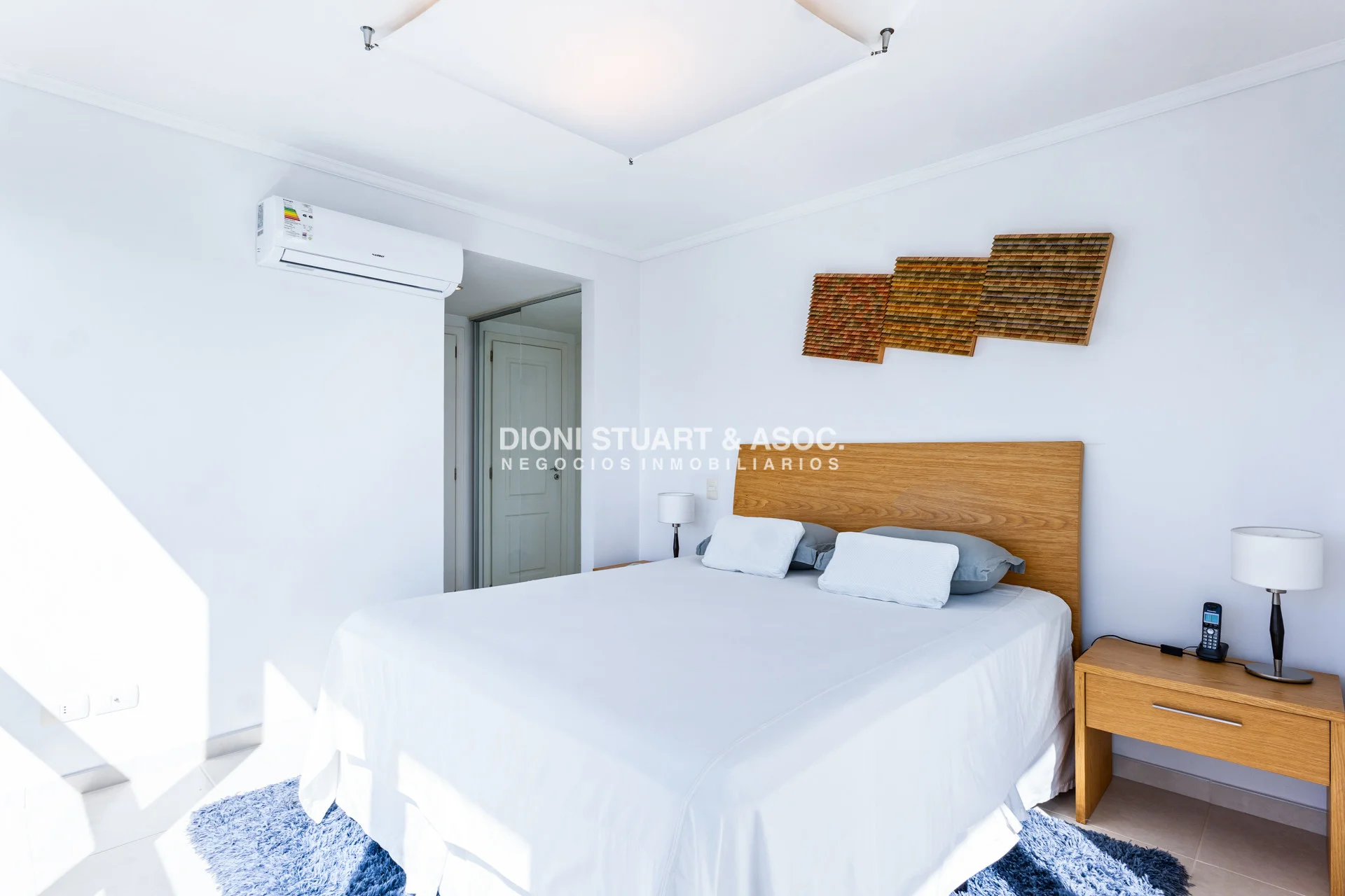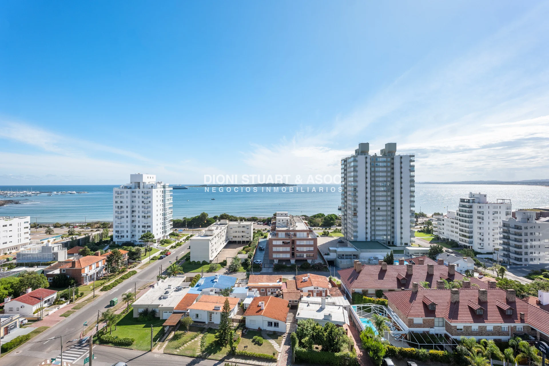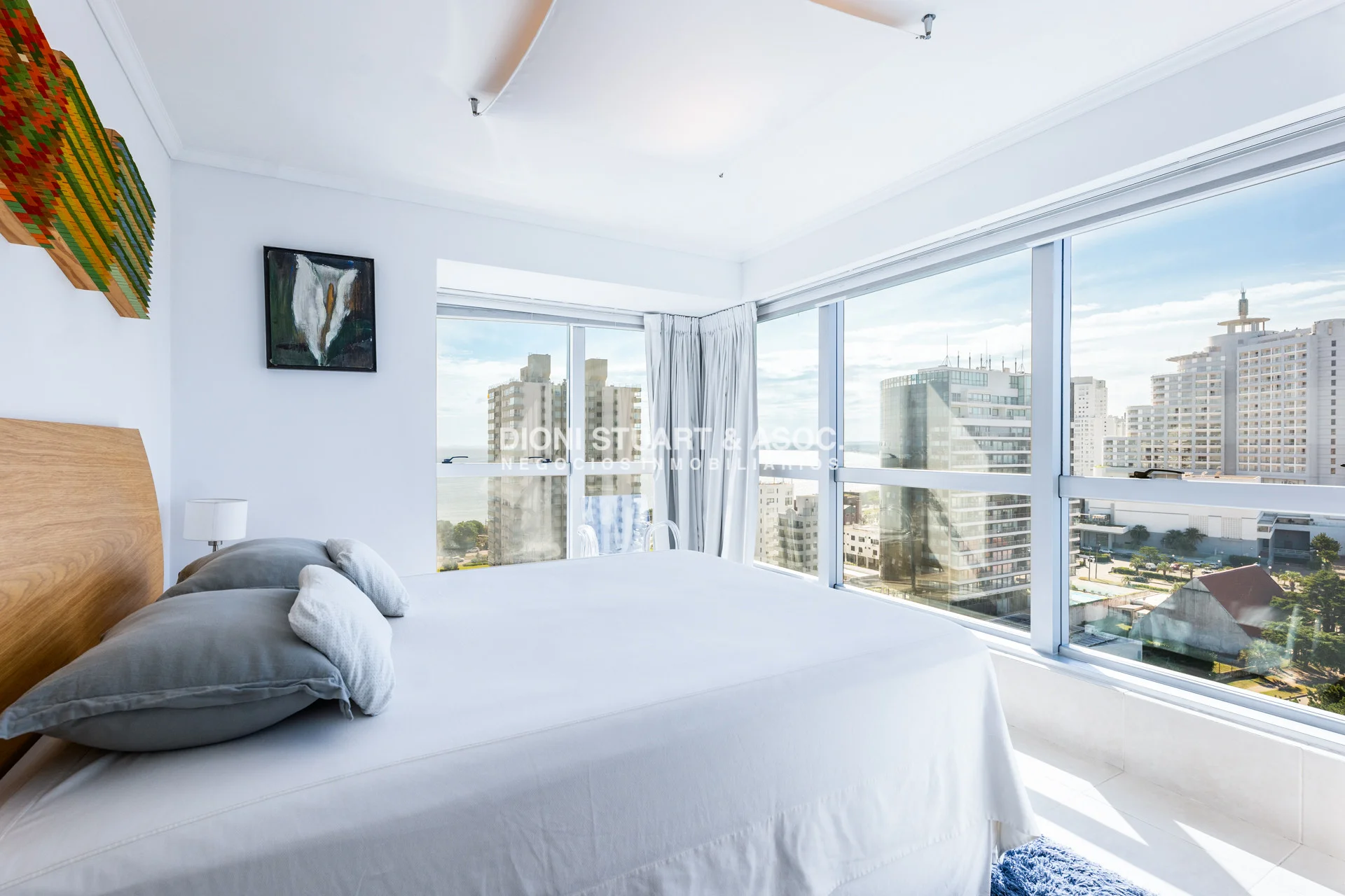 Apartamento esquinero, con un comodo living-comedor con una imponente vista al mar desde donde accedemos a una terraza balcón en forma de L con con parrillero y vista 180° desde Punta del Este a Punta Ballena. Cocina definida con lavarropas y lavavajillas, completamente equipada. Dos dormitorios y dos baños (principal en suite). El dormitorio principal esta orientado hacia el mar y es esquinado a Punta Ballena totalmente vidriado logrando asi recibir sol todo el día y haciendo de este un espacio ideal para el invierno por su climatización. De todas formas, la unidad cuenta con Aire en todos sus ambientes, loza radiante sectorizada, Rollers, Tv Smart, etc etc.