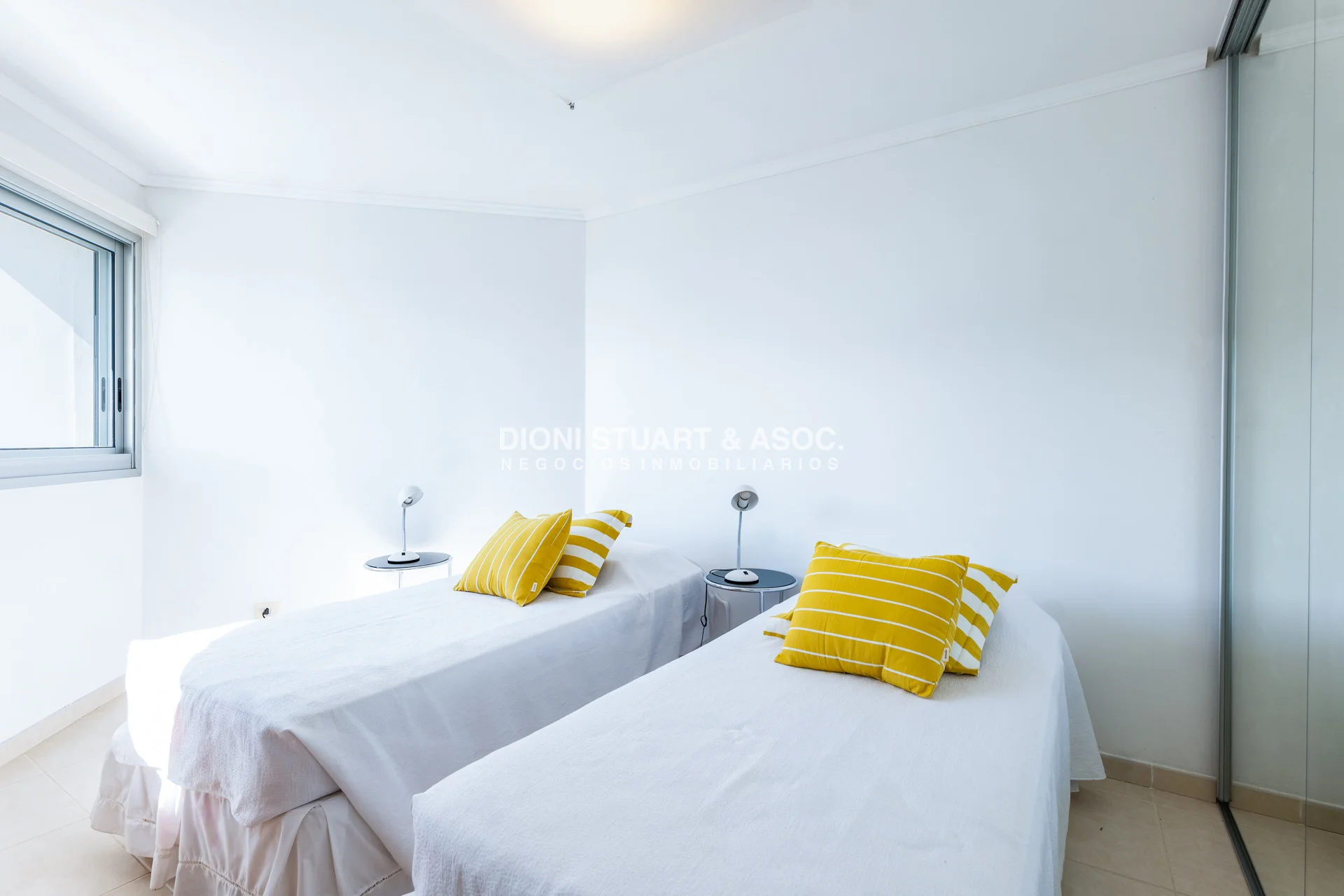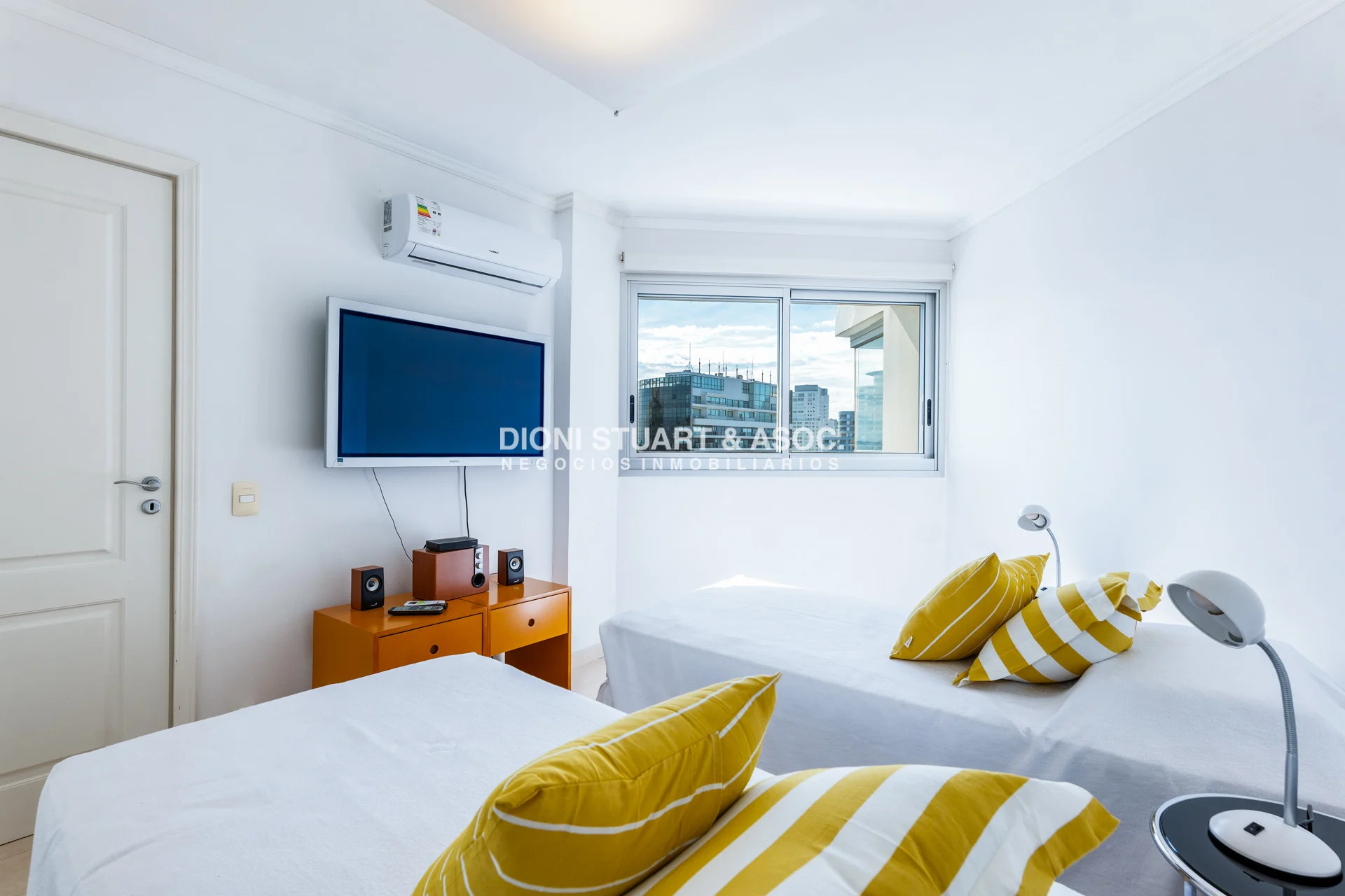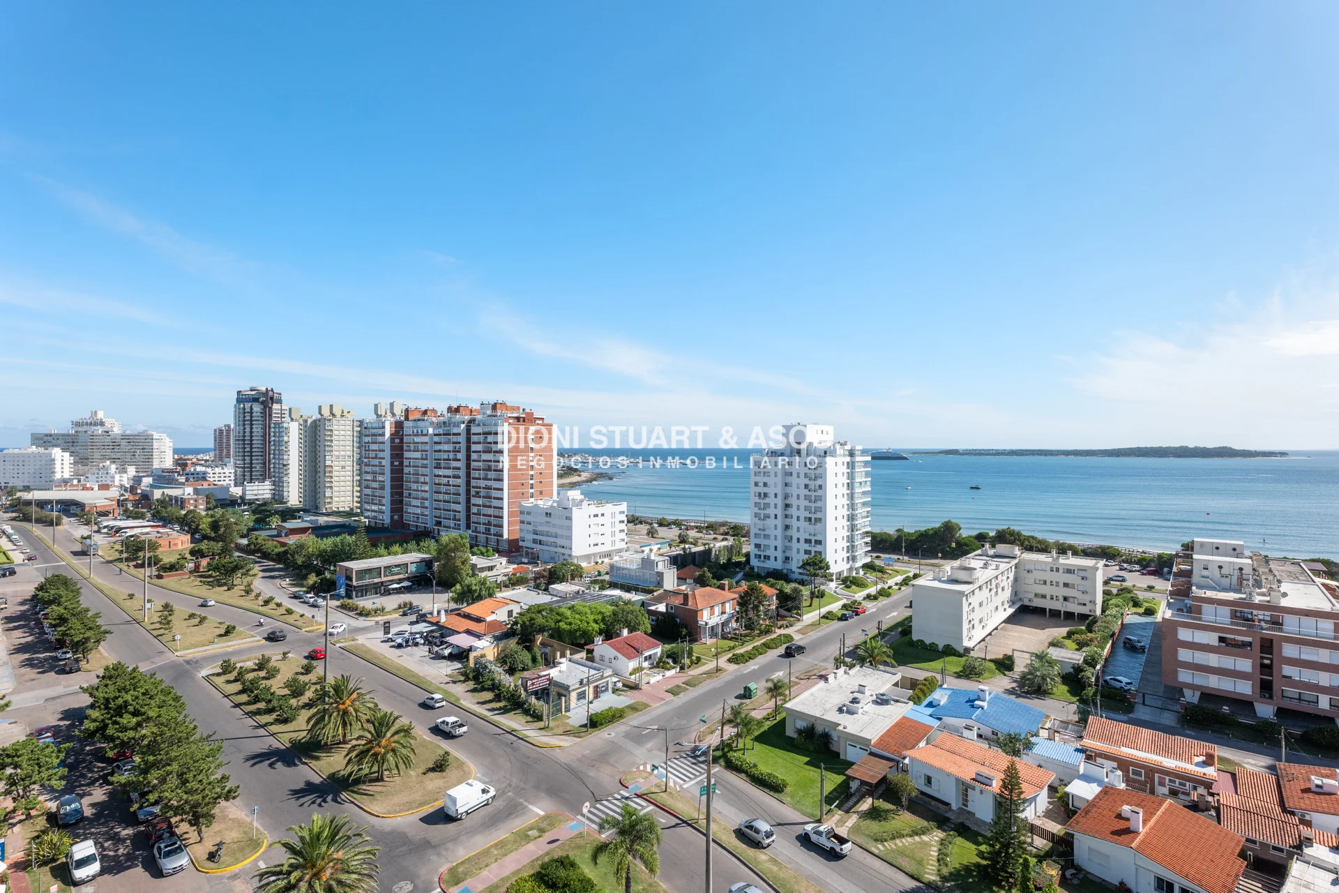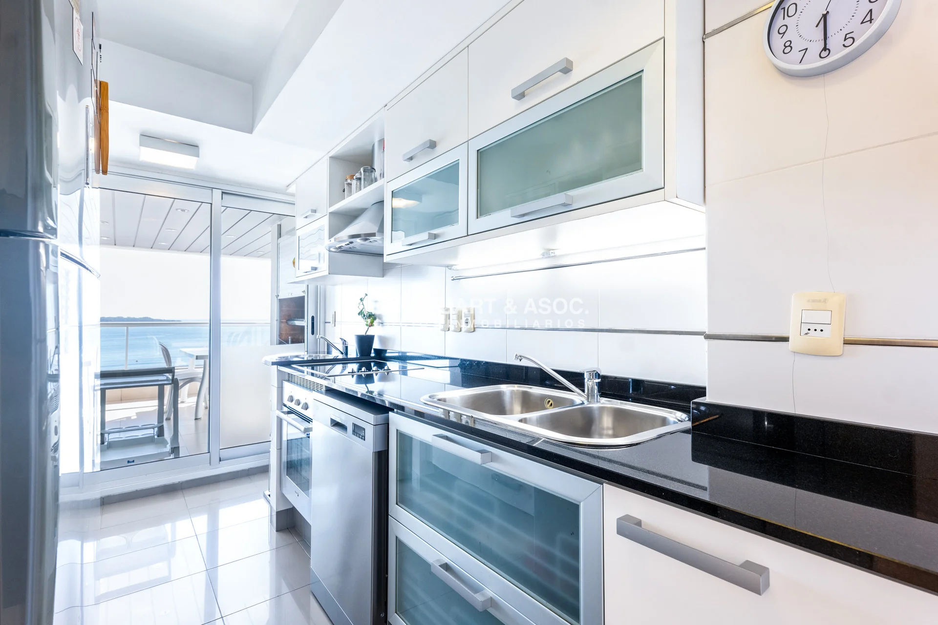 Apartamento esquinero, con un comodo living-comedor con una imponente vista al mar desde donde accedemos a una terraza balcón en forma de L con con parrillero y vista 180° desde Punta del Este a Punta Ballena. Cocina definida con lavarropas y lavavajillas, completamente equipada. Dos dormitorios y dos baños (principal en suite). El dormitorio principal esta orientado hacia el mar y es esquinado a Punta Ballena totalmente vidriado logrando asi recibir sol todo el día y haciendo de este un espacio ideal para el invierno por su climatización. De todas formas, la unidad cuenta con Aire en todos sus ambientes, loza radiante sectorizada, Rollers, Tv Smart, etc etc.
