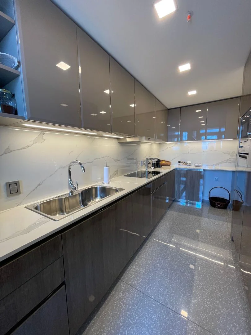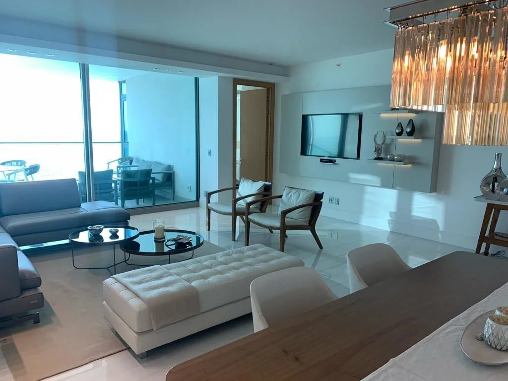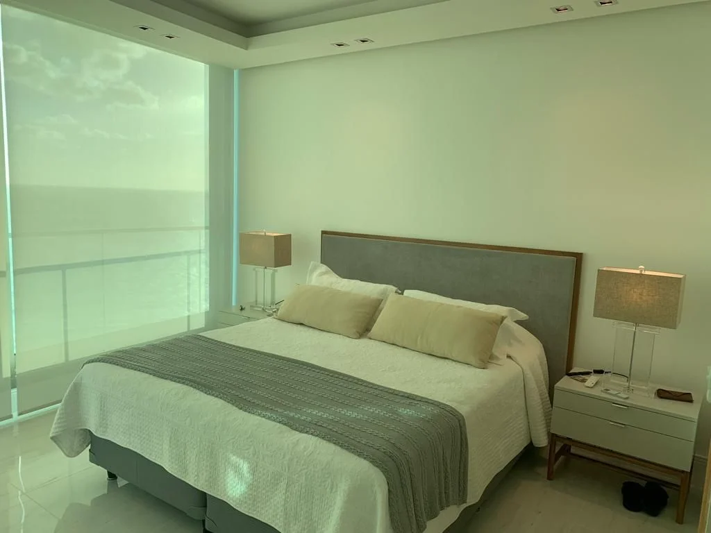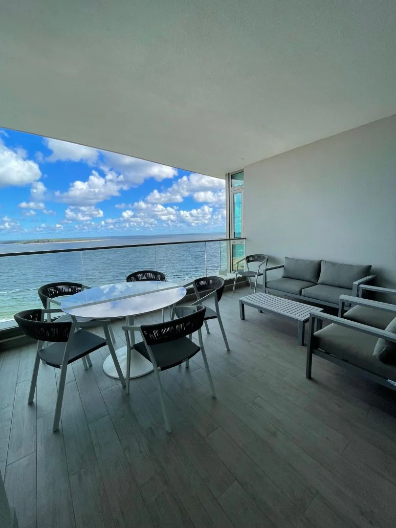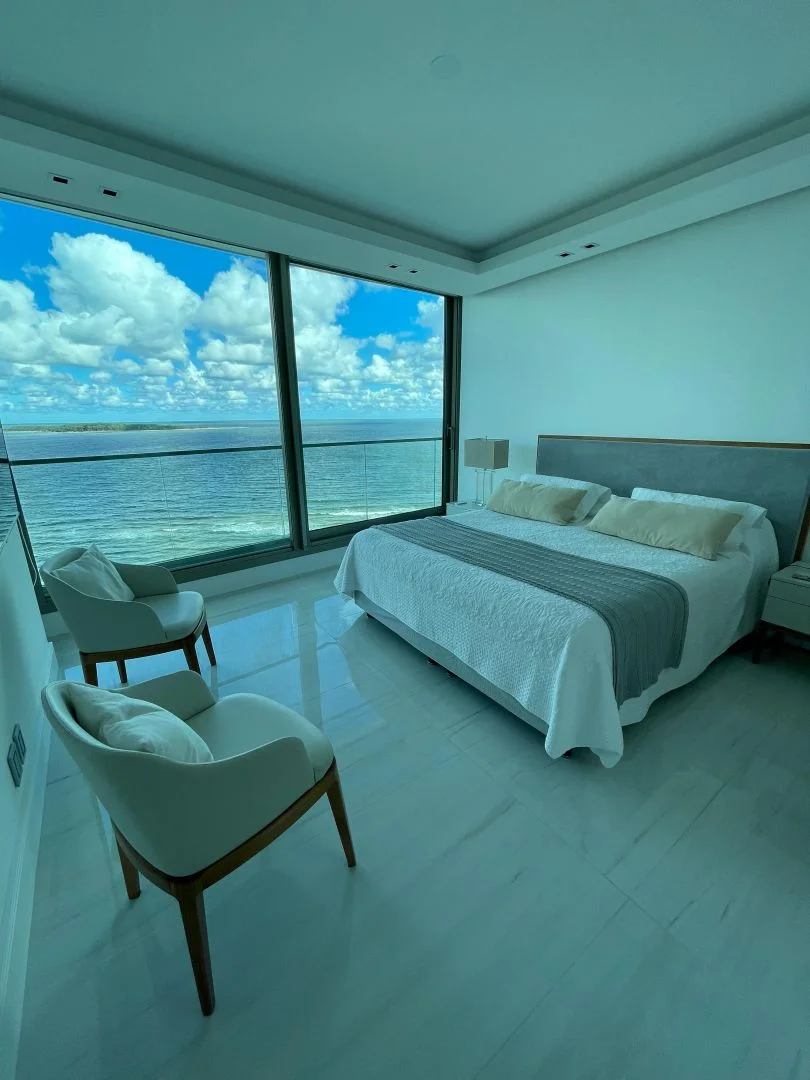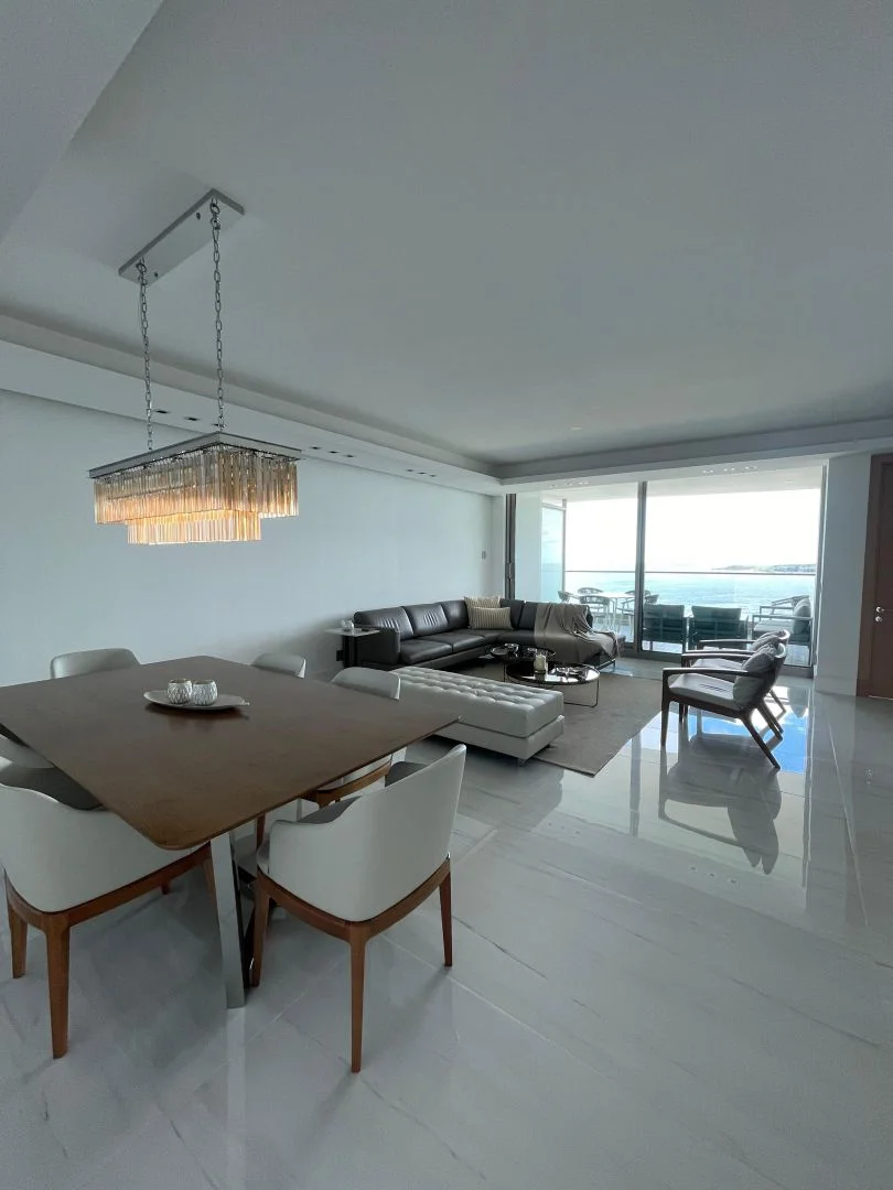 Espectacular apartamento de 3 dormitorios en suite, espacioso living, comedor, cocina totalmente equipada, toilette, terraza con vista directa al mar y puesta del sol.