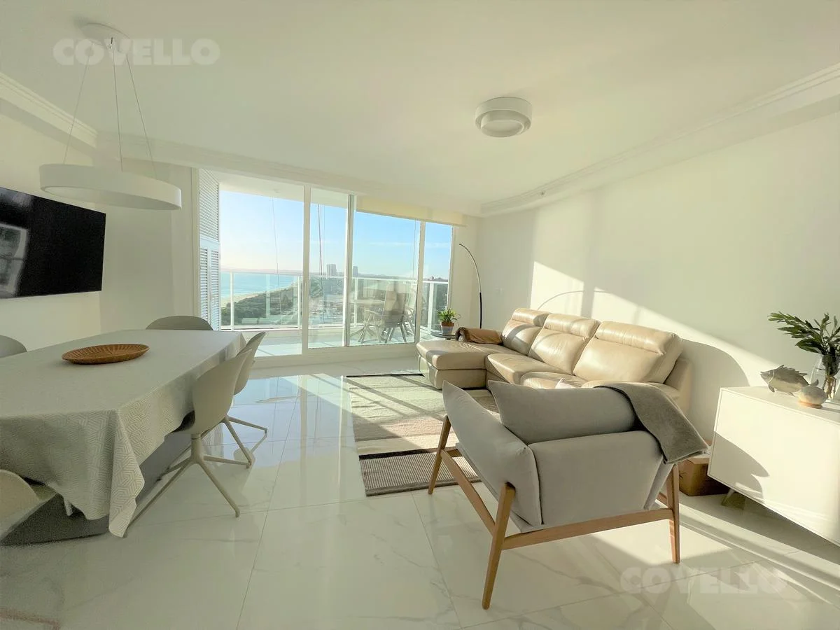 Apartamento lateral con vista al mar de la mansa. Ubicado en moderna torre con amenities de primer nivel en parada 10 de Playa Mansa. Cuenta con 2 dormitorios en suite, cocina definida, living comedor con salida a terrazas. Garaje en sub suelo.