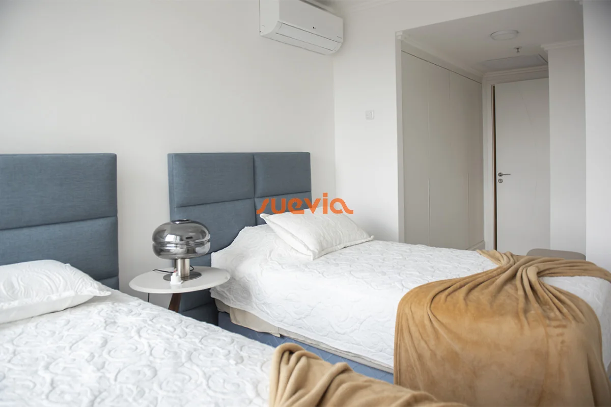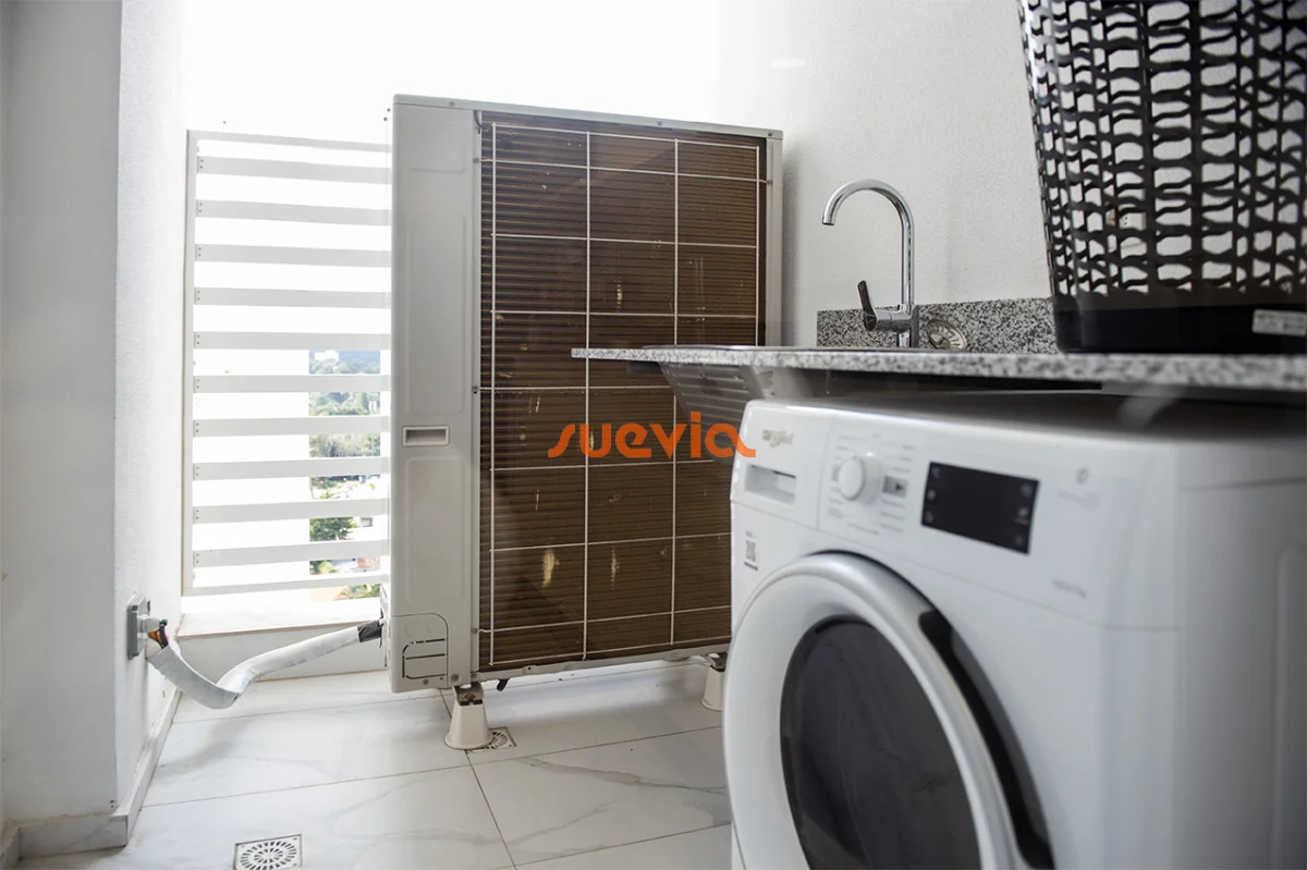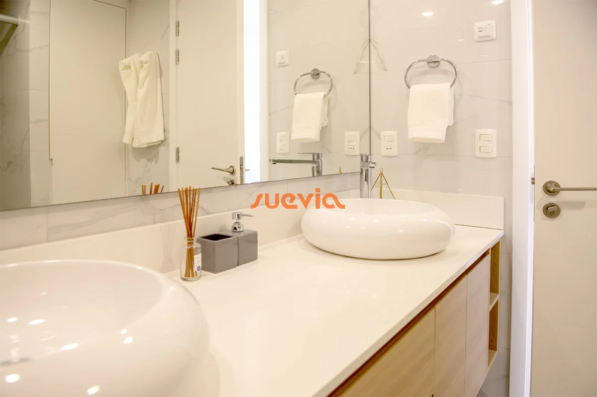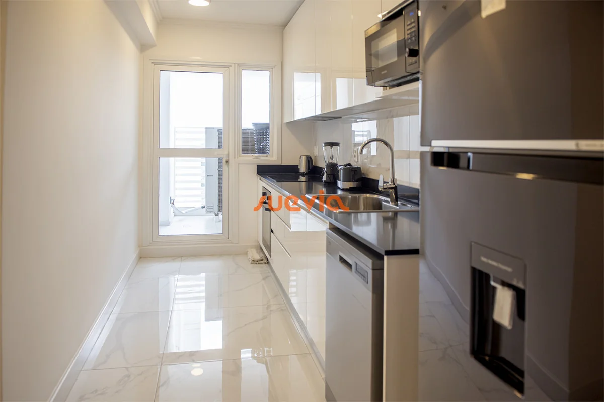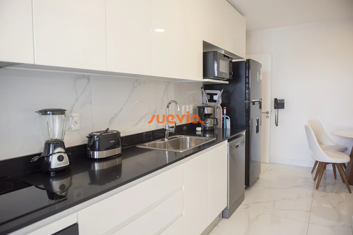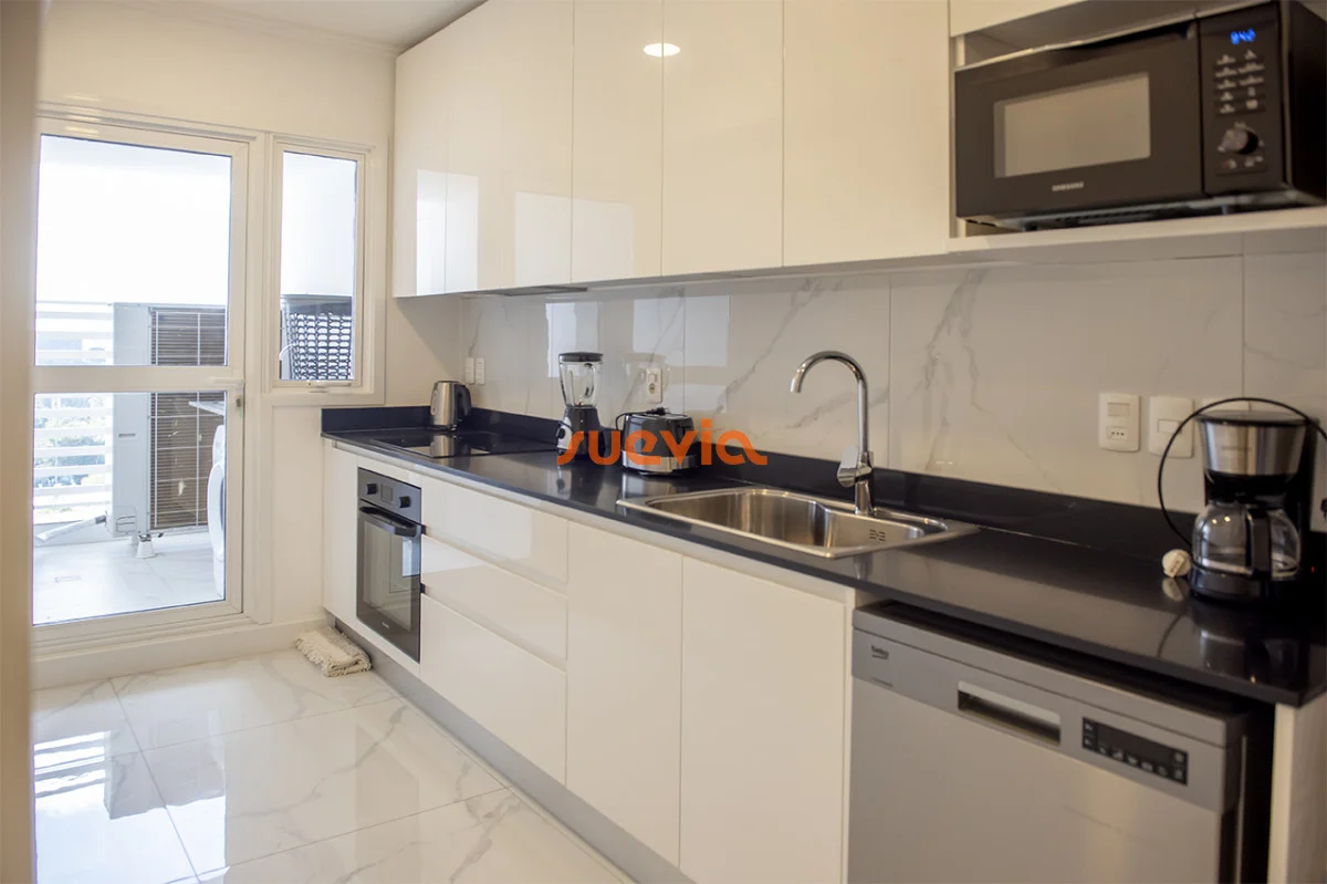 El equipamiento incluye microondas, lavavajillas, heladera con freezer, tostadora, horno, campana extractora, aire acondicionado y placares amplios tanto en dormitorios como en cocina, todo dispuesto para asegurar una experiencia confortable en cada estancia.