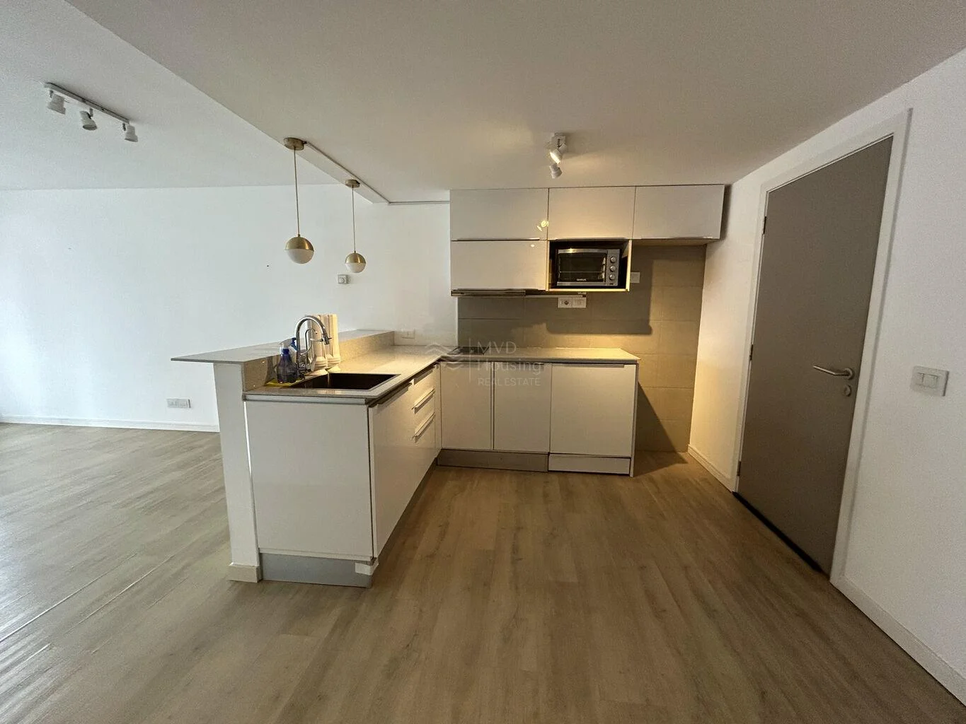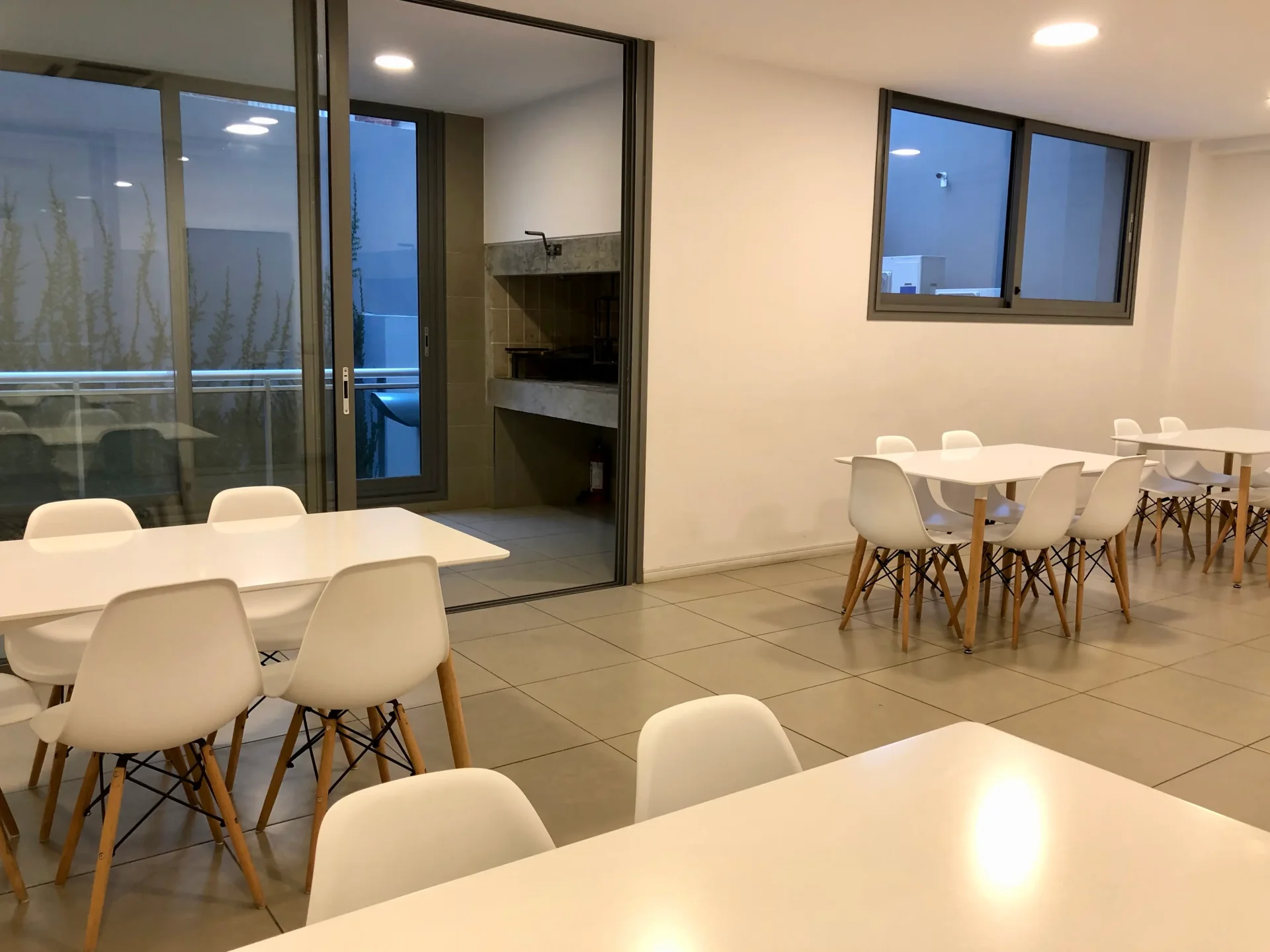 Living comedor con cocina integrada y barra, anafre eléctrico y pequeño horno eléctrico.