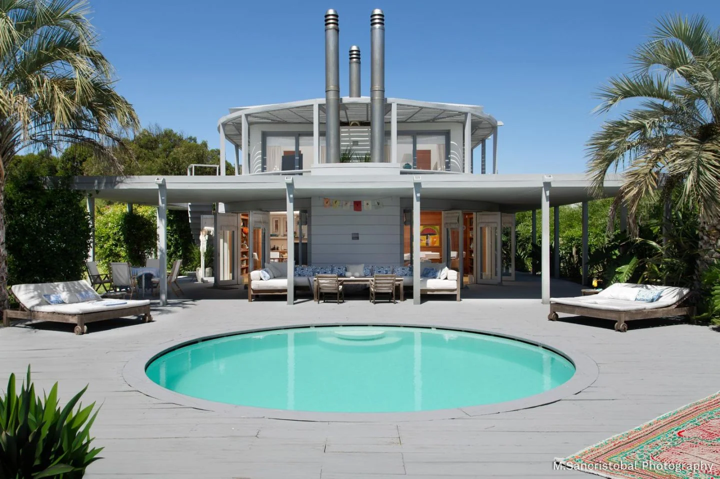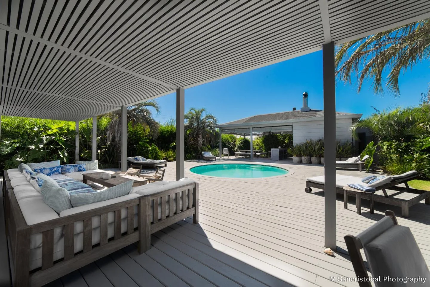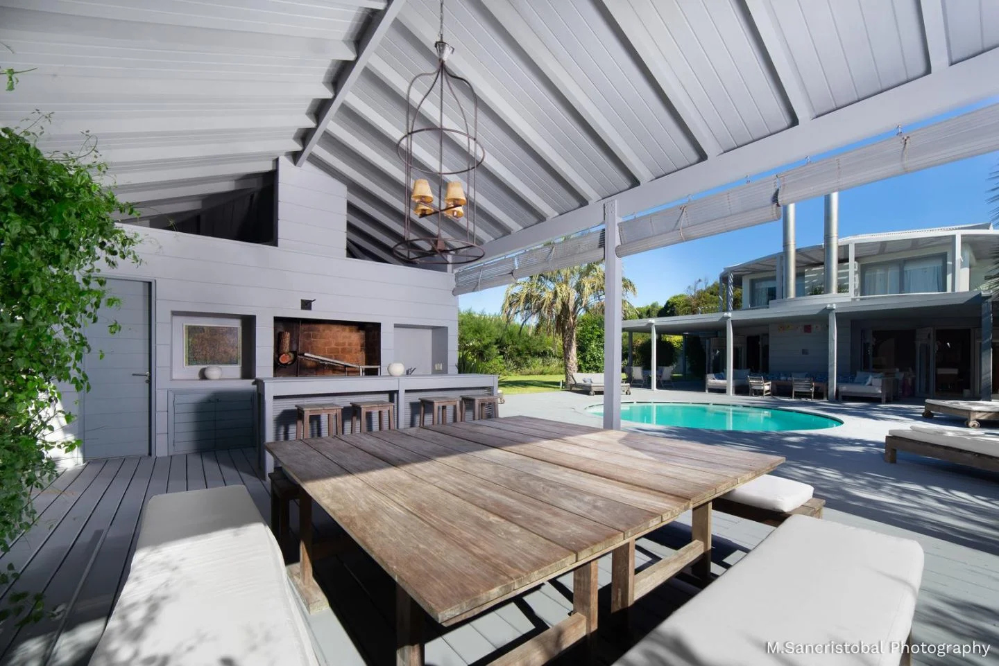 Esta zona se conecta a la casa y a una encantadora terraza a través de un deck, donde se encuentra una elegante piscina circular, perfecta para relajarse durante los días de verano.