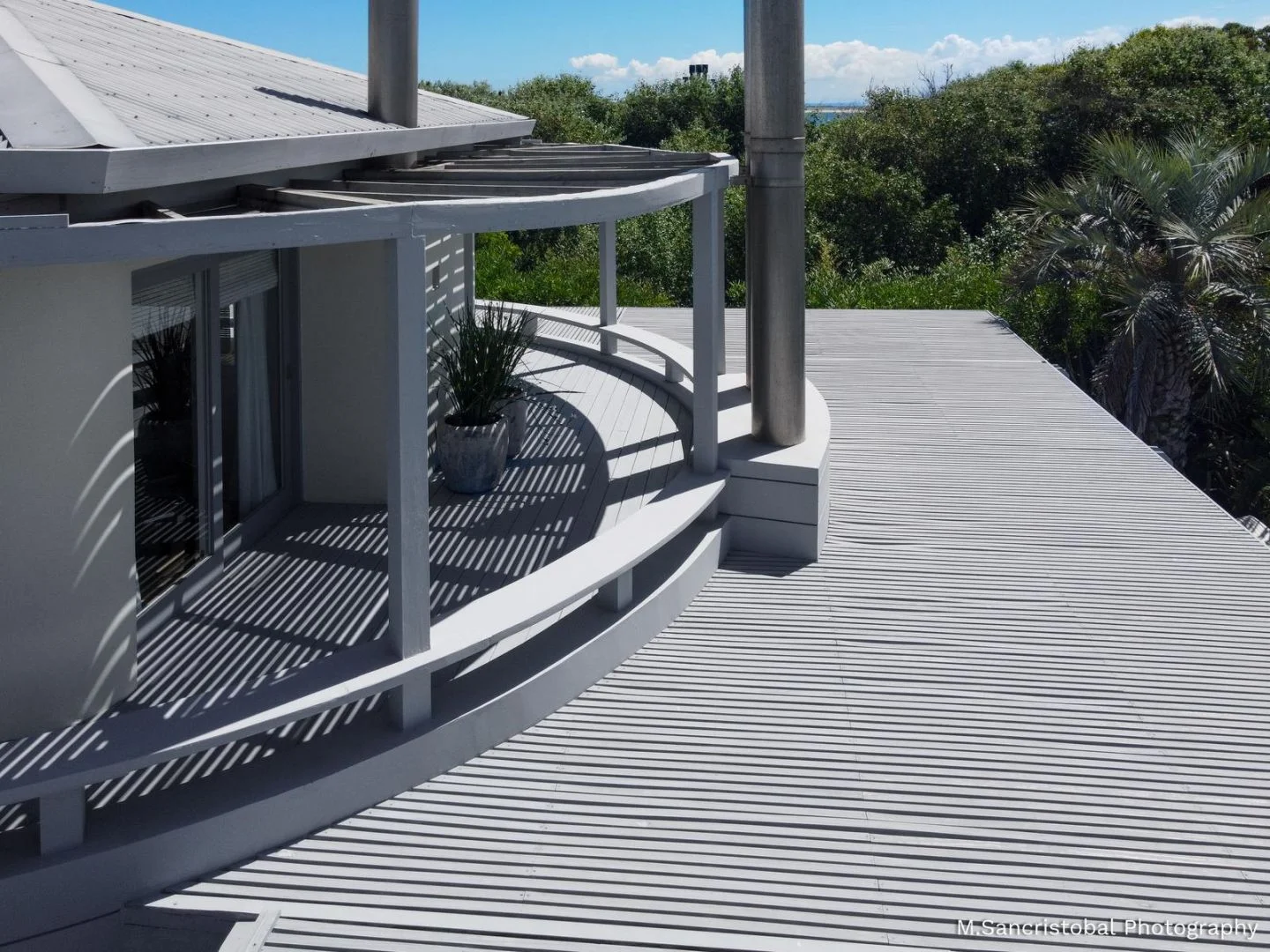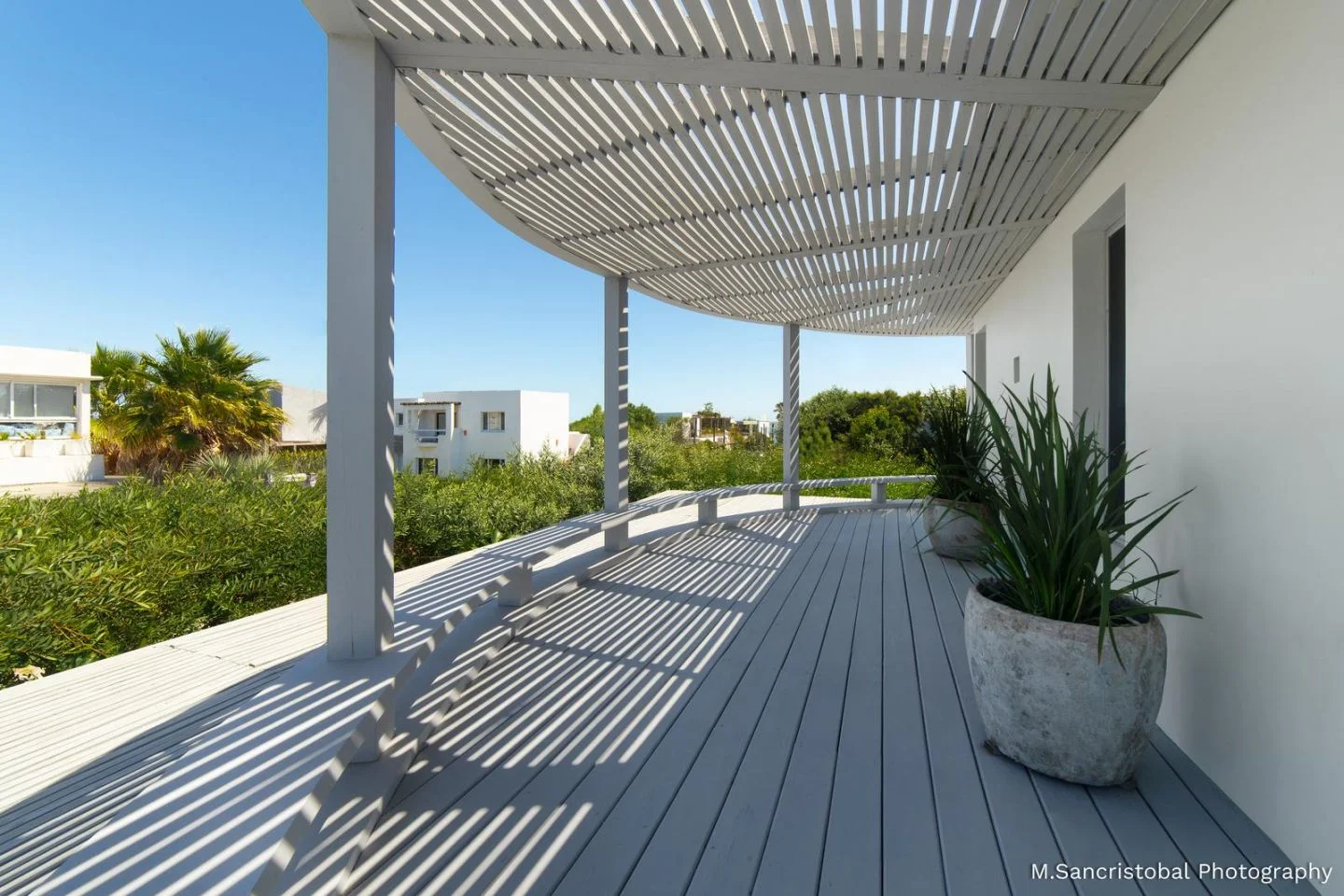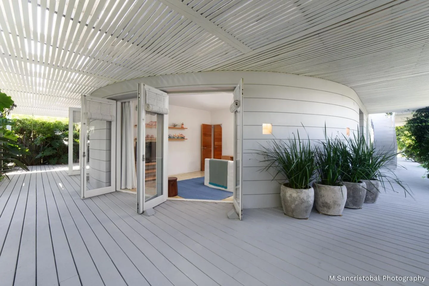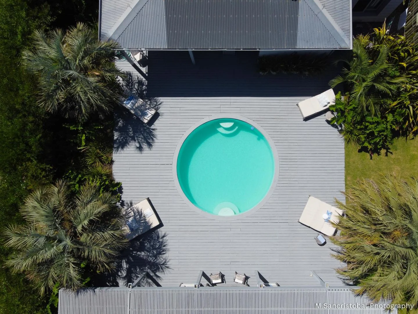 Esta zona se conecta a la casa y a una encantadora terraza a través de un deck, donde se encuentra una elegante piscina circular, perfecta para relajarse durante los días de verano.