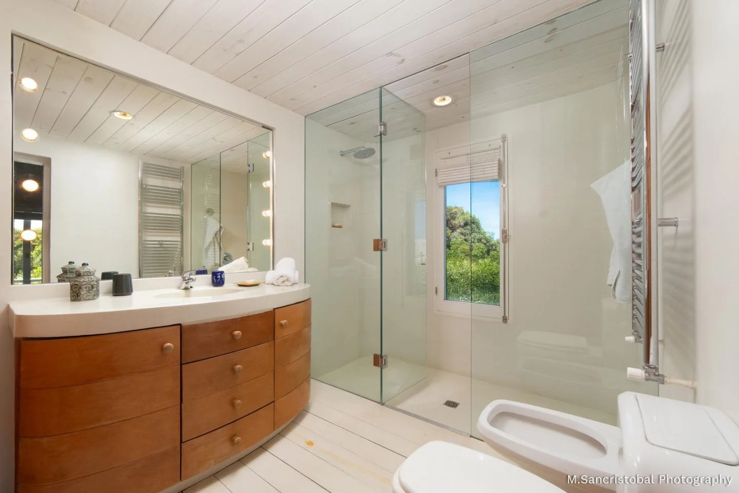 En planta alta encontramos otros dos dormitorios en suite, ambos con ventanales panorámicos que permiten disfrutar de una vista privilegiada hacia la costa y dan acceso a un balcón-terraza, que conecta con el jardín y la planta baja.