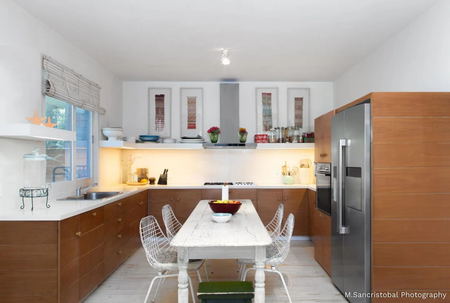 La cocina está completamente equipada y la planta baja incluye además un toilette para mayor comodidad.