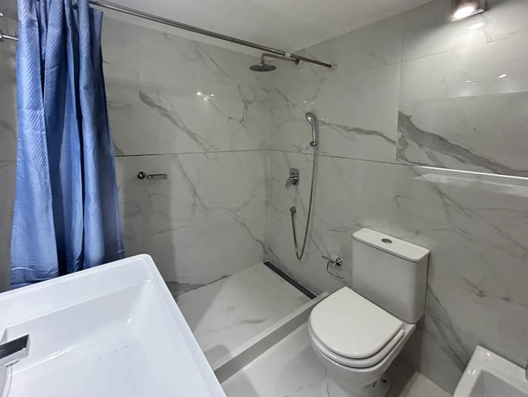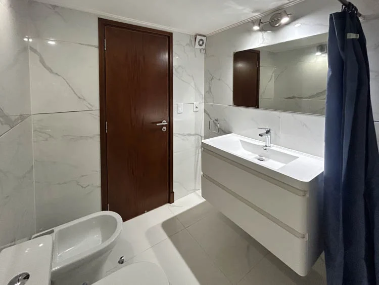 Un baño completo con grifería y revestimientos de primera línea.