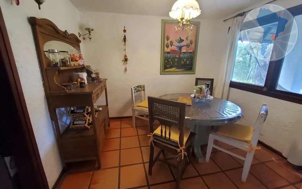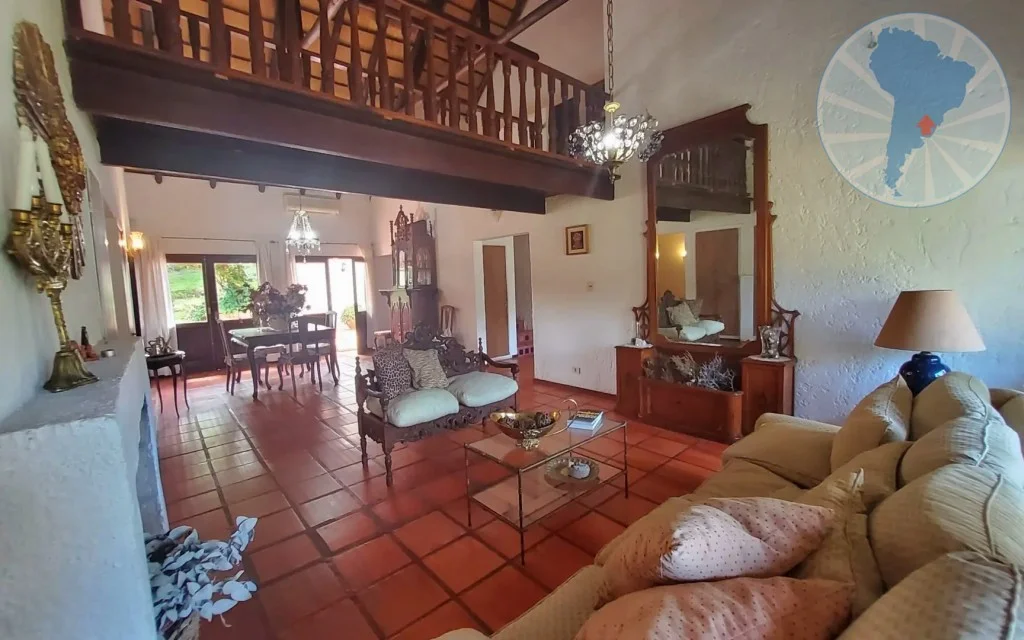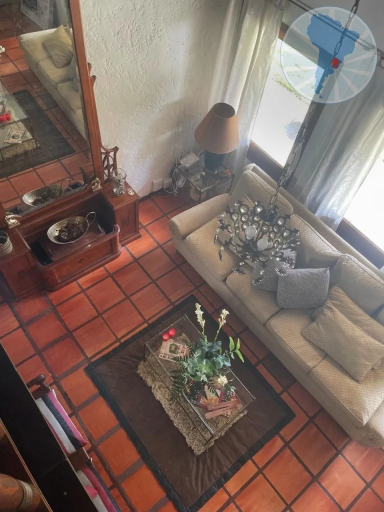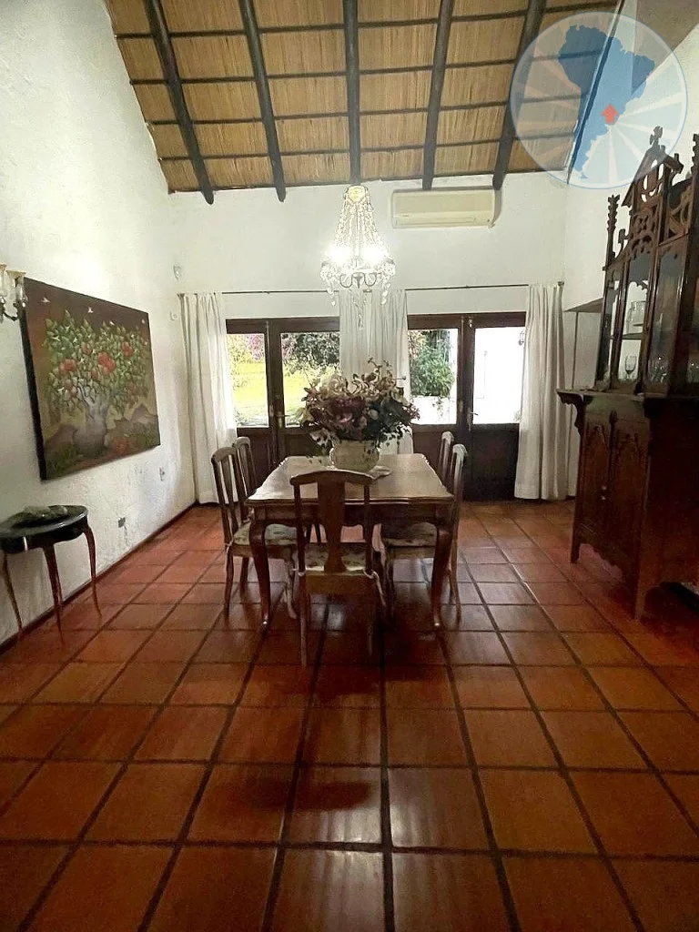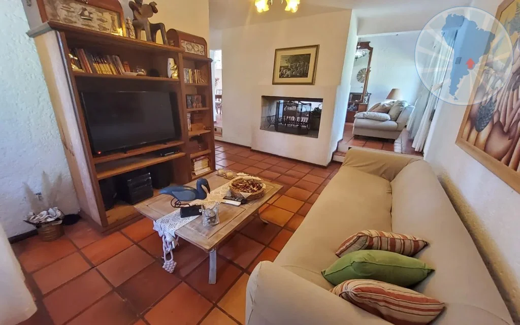 El living-comedor se destaca por su amplitud y su elegante decoración con muebles de madera de alta calidad. En el centro se encuentra un hogar a leña que aporta calidez y un ambiente muy acogedor. Además, la casa cuenta con un estar de TV independiente y un cómodo comedor diario.