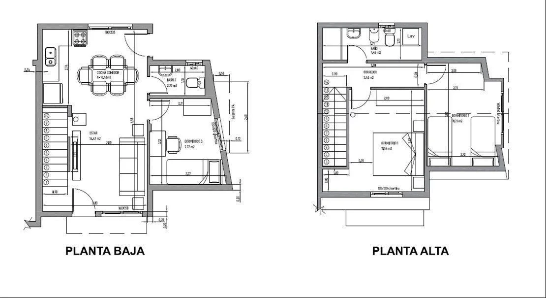 En planta baja, living comedor con cocina integrada, toilette y un dormitorio. En planta alta tenemos otros 2 dormitorios y un baño completo.