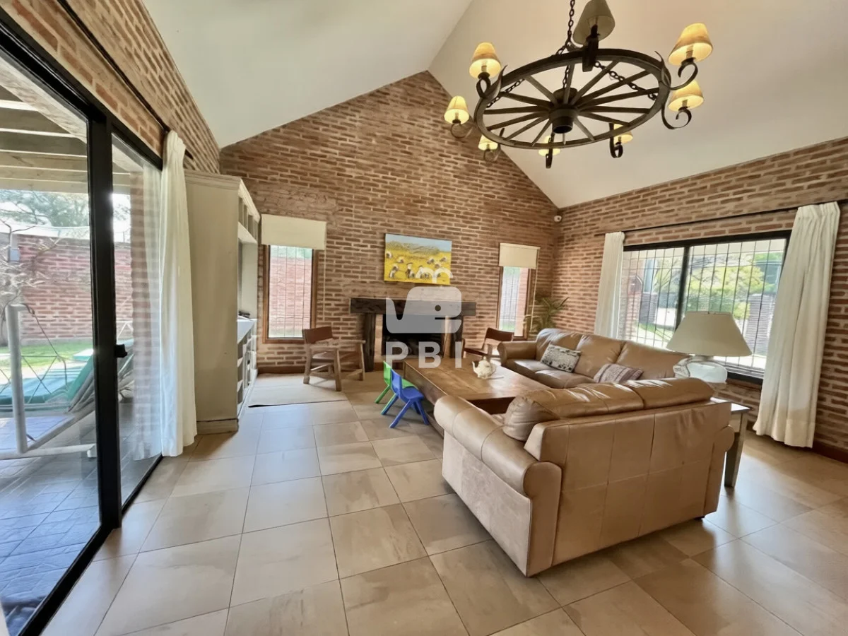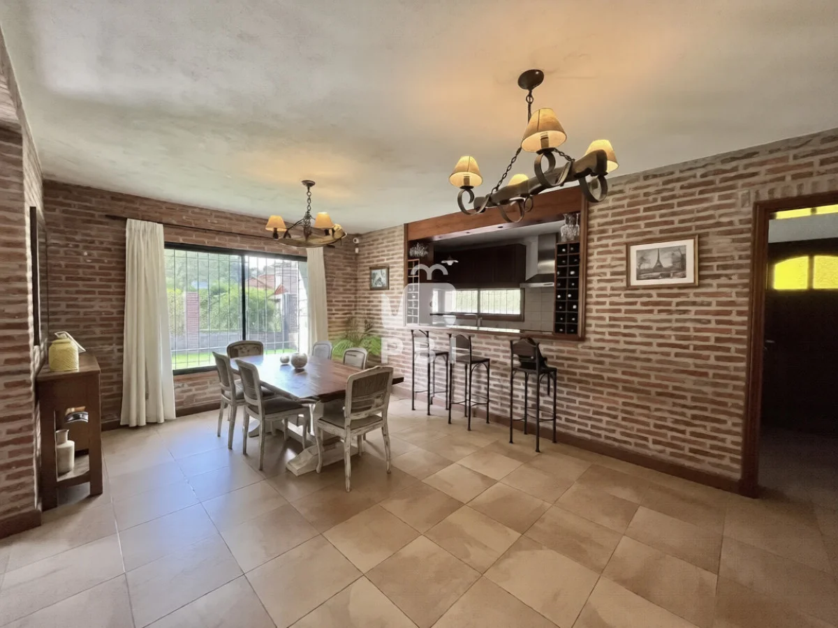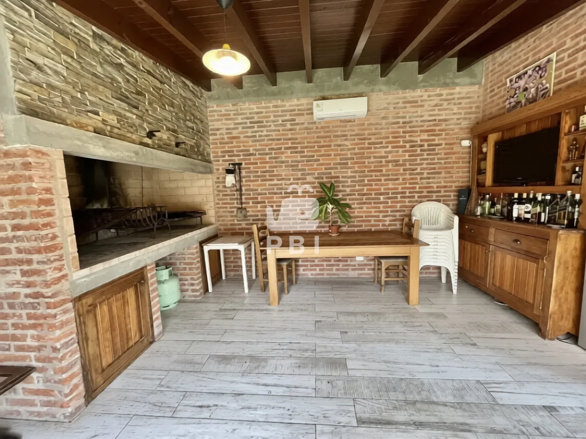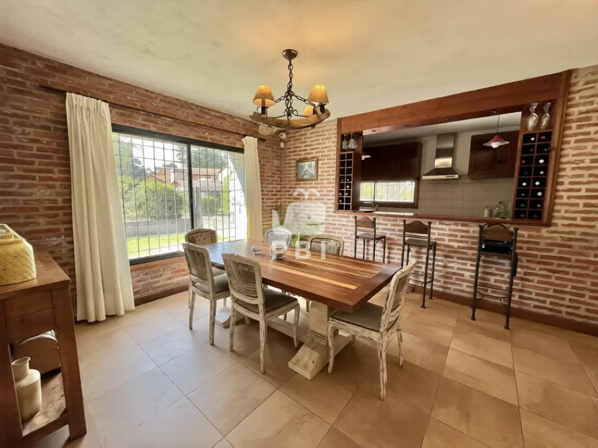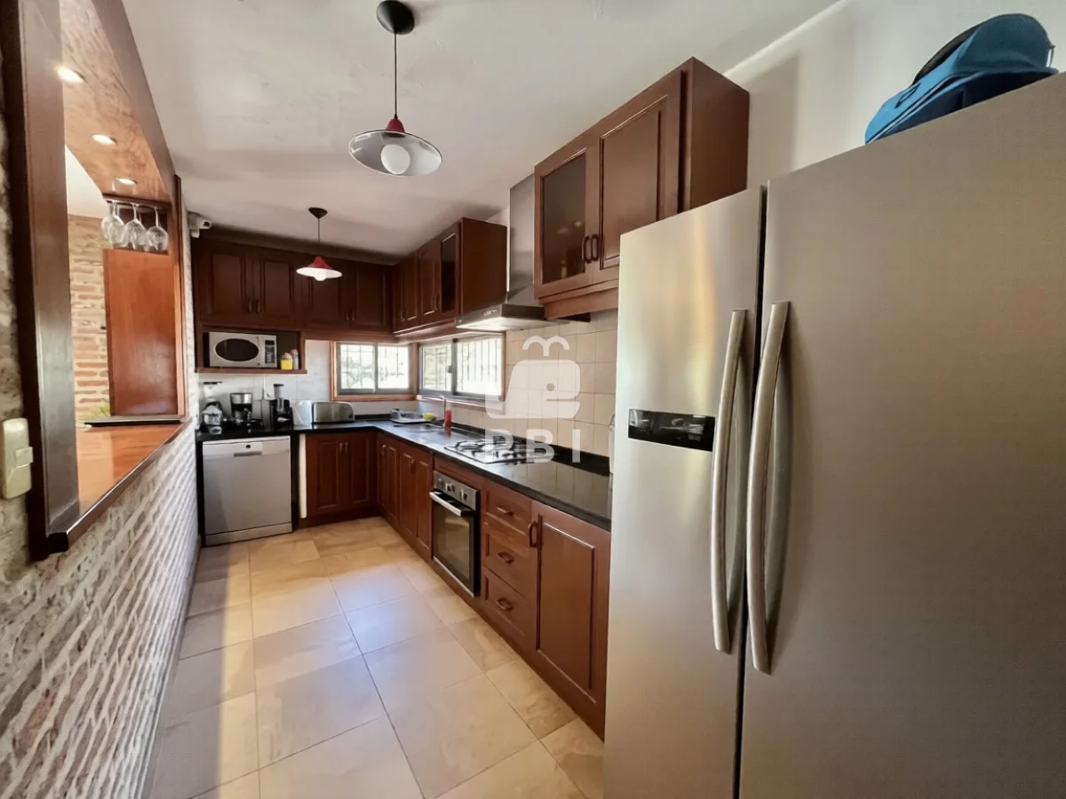 La propiedad cuenta con cuatro dormitorios, uno de ellos en suite, y tres baños. El área social incluye un amplio living comedor con estufa a leña y cocina integrada.